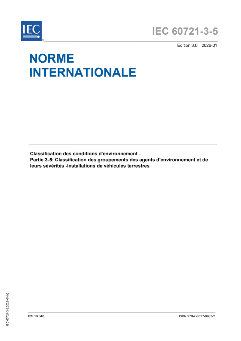 IEC 60721-3-5:2026 - Classification des conditions d'environnement - Partie 3-5: Classification des groupements des agents d'environnement et de leurs sévérités -Installations de véhicules terrestres Released:14. 01. 2026 Isbn:9782832709832