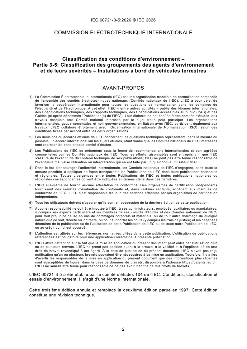 IEC 60721-3-5:2026 is a standard published by the International Electrotechnical Commission (IEC). Its full title is "Classification of environmental conditions - Part 3-5: Classification of groups of environmental parameters and their severities - Ground vehicle installations". This standard covers: IEC 60721-3-5:2026 classifies the groups of environmental parameters and their severities to which a product, not forming part of the vehicle, is subjected when installed on or in a ground vehicle. Such products are for example radios, communication systems, fare meters, flow meters for liquids transported by the vehicle, for example milk, petroleum products, etc. Vehicles where products can be permanently or temporarily installed include - road vehicles: passenger cars, commercial vehicles, special vehicles, towing vehicles, trailers, mopeds, motorcycles, - rail vehicles: trains, trams, - tracked vehicles: excavators, cranes, rubber tracked vehicles, - overland vehicles: four-wheel drive cars, tractors, snow scooters, - handling and storage vehicles: fork-lift trucks (manual and robot), luggage transporters, and - self-propelled machinery: diggers, harvesters. This third edition cancels and replaces the second edition, published in 1997. This edition constitutes a technical revision. This edition includes the following significant technical changes with respect to the previous edition: a) most classes have been replaced by completely new classes based on the use of additional information obtained from referenced Technical Reports; b) Table 1 through to Table 7 have been reviewed and updated; c) the content of Annex A and Annex B has either been incorporated into the main body of the document or deleted.