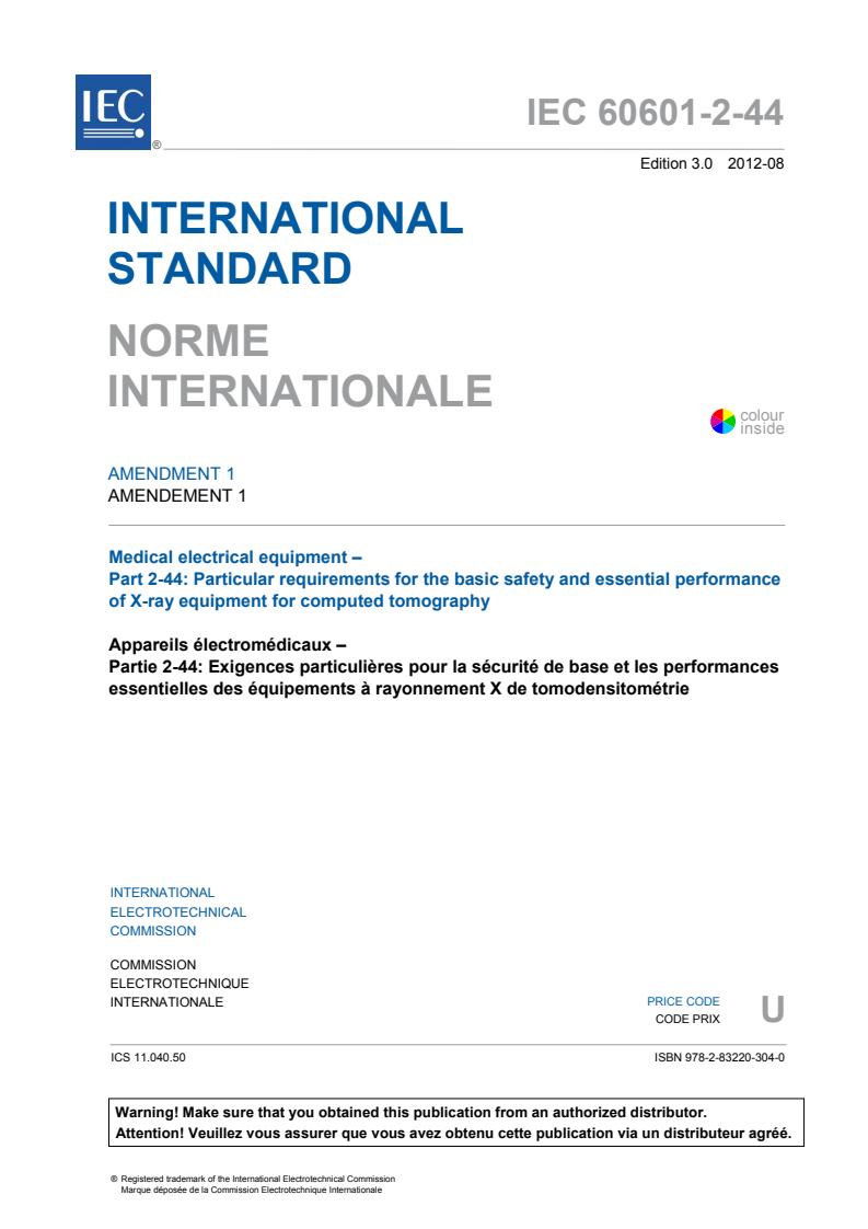 IEC 60601-2-44:2009/AMD1:2012 - Amendment 1 - Medical electrical equipment - Part 2-44: Particular requirements for the basic safety and essential performance of X-ray equipment for computed tomography Released:8/30/2012