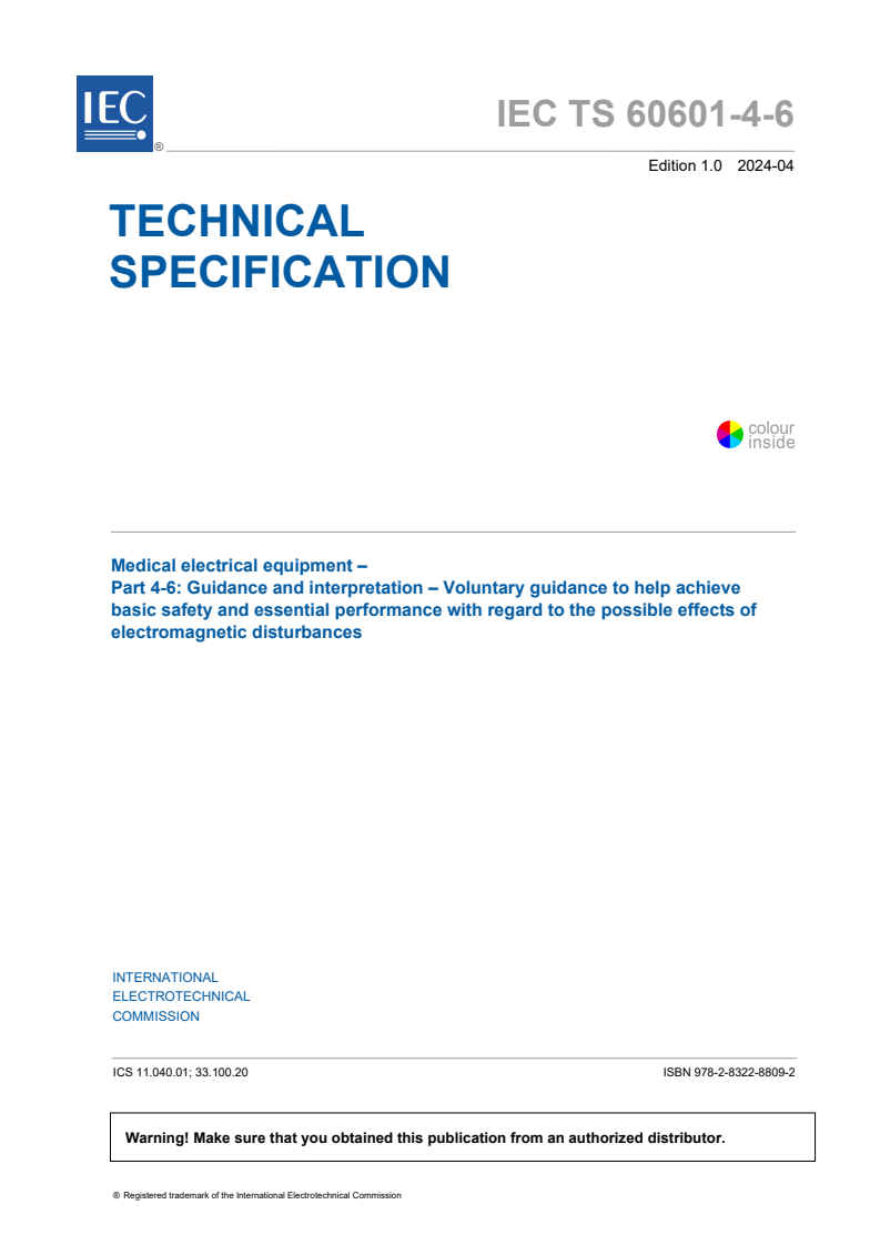 IEC TS 60601-4-6:2024 is a technical specification published by the International Electrotechnical Commission (IEC). Its full title is "Medical electrical equipment - Part 4-6: Guidance and interpretation - Voluntary guidance to help achieve basic safety and essential performance with regard to the possible effects of electromagnetic disturbances". This standard covers: IEC TS 60601-4-6:2024 provides practical methods to help achieve basic safety and essential performance with regard to the possible effects of em disturbances throughout the expected service life of me equipment or an me system. These practical methods attempt to address all of the different types of errors, malfunctions or failures that can be caused by em disturbances in me equipment or me systems. The purpose of this document is to provide recommendations for the techniques and measures used in the design, verification, and validation of systems, hardware, software, and firmware used in me equipment or me systems to help achieve basic safety and essential performance with regard to the em disturbances that could occur throughout the expected service life.
