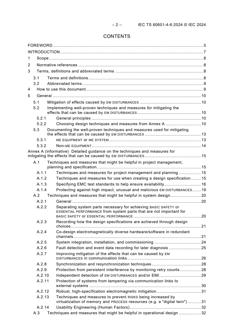 IEC TS 60601-4-6:2024 provides practical methods to help achieve basic safety and essential performance with regard to the possible effects of em disturbances throughout the expected service life of me equipment or an me system.