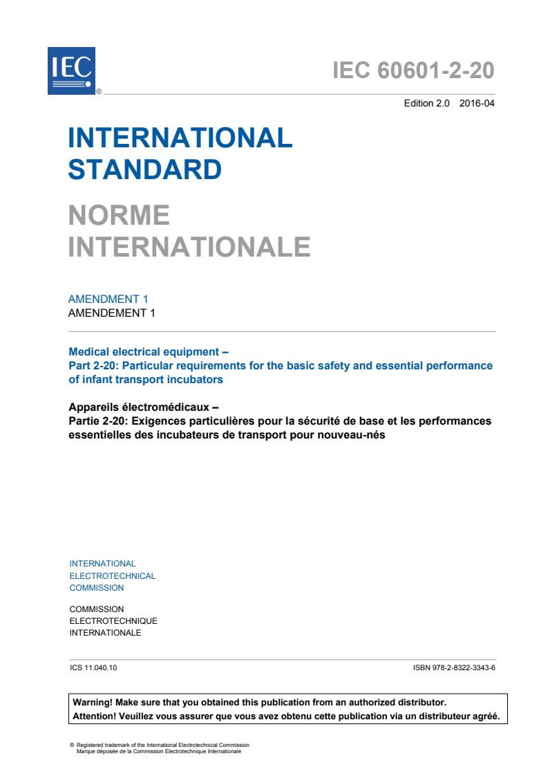 IEC 60601-2-20:2009/AMD1:2016 is a standard published by the International Electrotechnical Commission (IEC). Its full title is "Amendment 1 - Medical electrical equipment - Part 2-20: Particular requirements for the basic safety and essential performance of infant transport incubators". This standard covers: Amendment 1 - Medical electrical equipment - Part 2-20: Particular requirements for the basic safety and essential performance of infant transport incubators