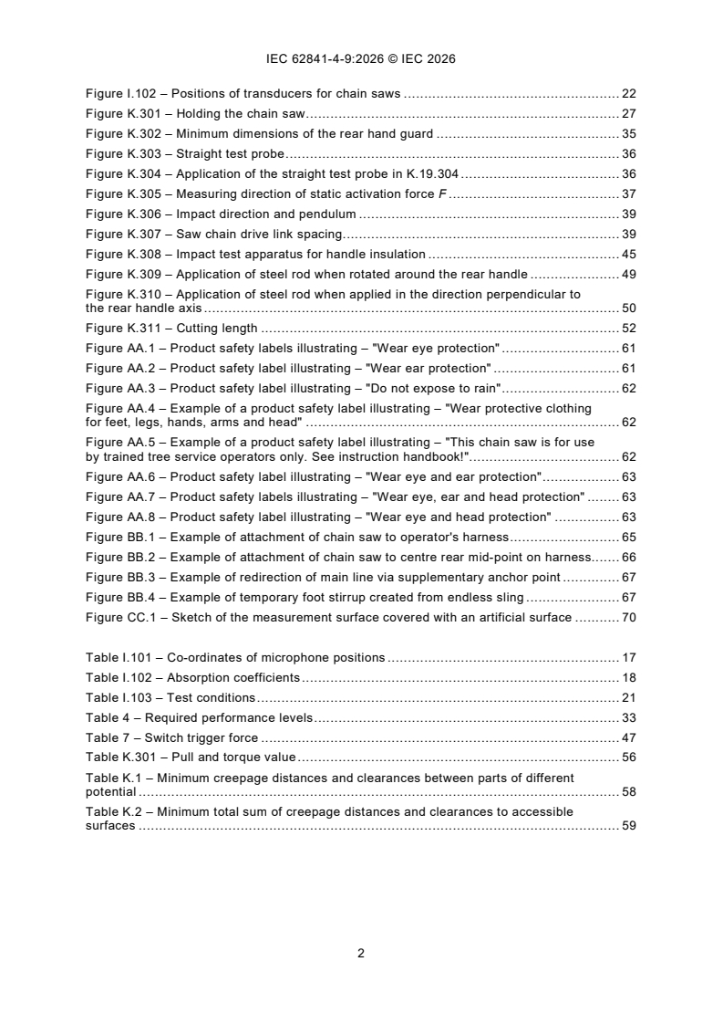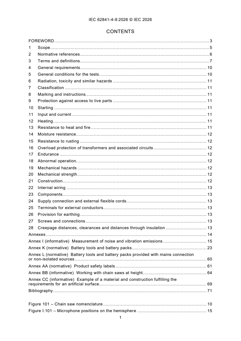 IEC 62841-4-9:2026 is an international standard developed by the International Electrotechnical Commission (IEC) focused on the safety requirements for battery-powered, motor-operated chain saws specifically designed for tree service. This standard applies to rechargeable chain saws with a maximum mass of 5.0 kg, including the heaviest detachable battery pack(s) but excluding the guide bar, saw chain, and chain lubricant. Chain saws under this scope are intended for professional tree service operations such as pruning and dismantling standing tree crowns and are designed to be operated using both hands, with the right hand on the rear handle and the left on the front handle.