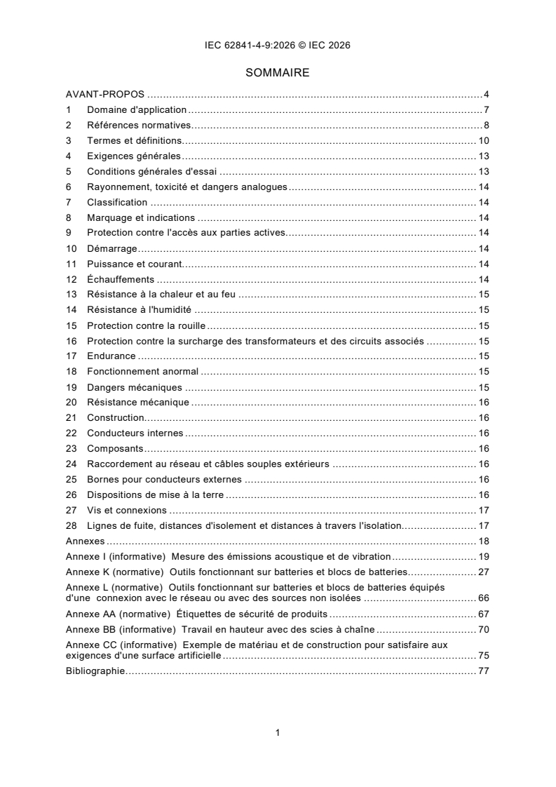 IEC 62841-4-9:2026 s'applique aux scies à chaîne pour l'élagage des arbres à moteur alimentées par des batteries rechargeables, ci-après dénommées scies à chaîne ou machines, d'une masse maximale de 5,0 kg. La masse comprend le plus lourd du ou des blocs de batteries amovibles, le cas échéant, tels qu'ils sont décrits dans l'IEC 62841-1:2014, K.8.14.2 e) 2), mais exclut le guide-chaîne, la chaîne coupante et le lubrifiant de la chaîne coupante. Les scies à chaîne couvertes par le présent document sont destinées à être utilisées pour élaguer et tailler les parties supérieures des arbres sur pied.