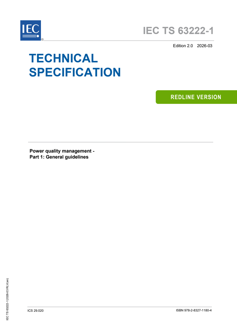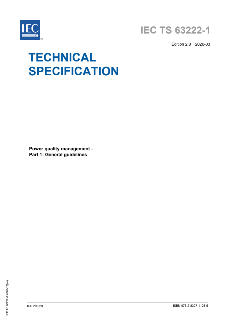 IEC TS 63222-1:2026 is a technical specification published by the International Electrotechnical Commission (IEC). Its full title is "Power quality management - Part 1: General guidelines". This standard covers: IEC TS 63222-1:2026 is intended to provide provisions associated to the main use cases regarding recognized engineering practices applicable to power quality management in public electric power supply networks. It summarizes the operation in power quality management and investigates the current standards, for requirement of power quality assessment work, as well as to promote the development of power quality management best practices. The power quality management domain groups use cases and associated power quality requirement common to network management, including customer support network operation, network and extension planning. This document captures possible "common and repeated usage" of power quality management under the format of "use case". Use case implementations are given for information purpose only. This document derives the common requirement as provisions by further standardization activities, in terms of actors interacting with the given system. The interface requirement is considered for later standardization activities. The relationship of the stakeholders in power quality management, such as network operator, network user, etc, are discussed in the document. This second edition cancels and replaces the first edition published in 2022. This edition includes the following significant technical changes with respect to the previous edition: - this document completes the use cases planned in IEC 63222-1:2022: four business use cases and three system use cases are added; - this document makes adjustments to the wording of certain phrases and technical details in IEC 63222-1:2022.