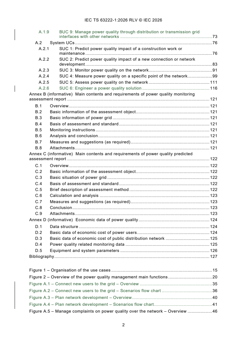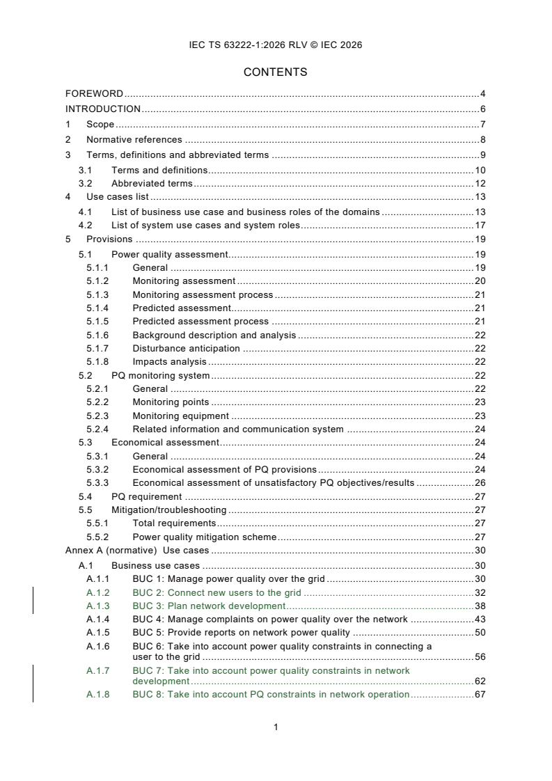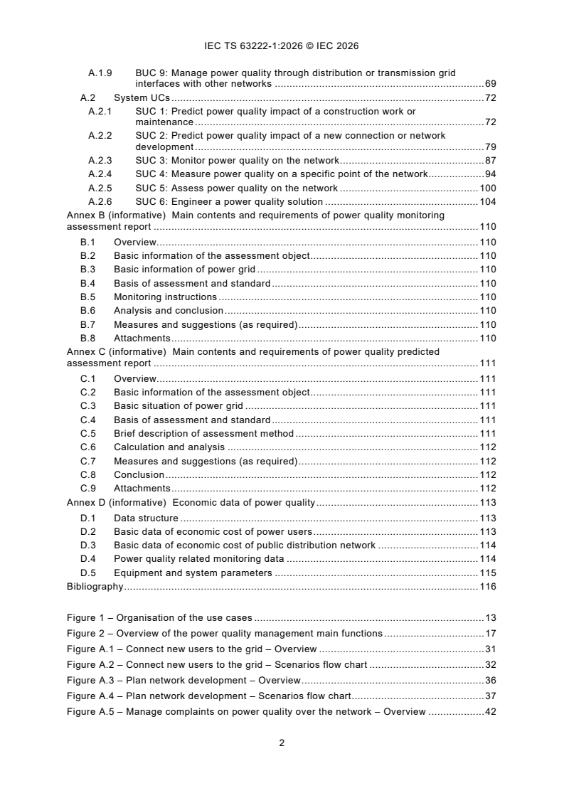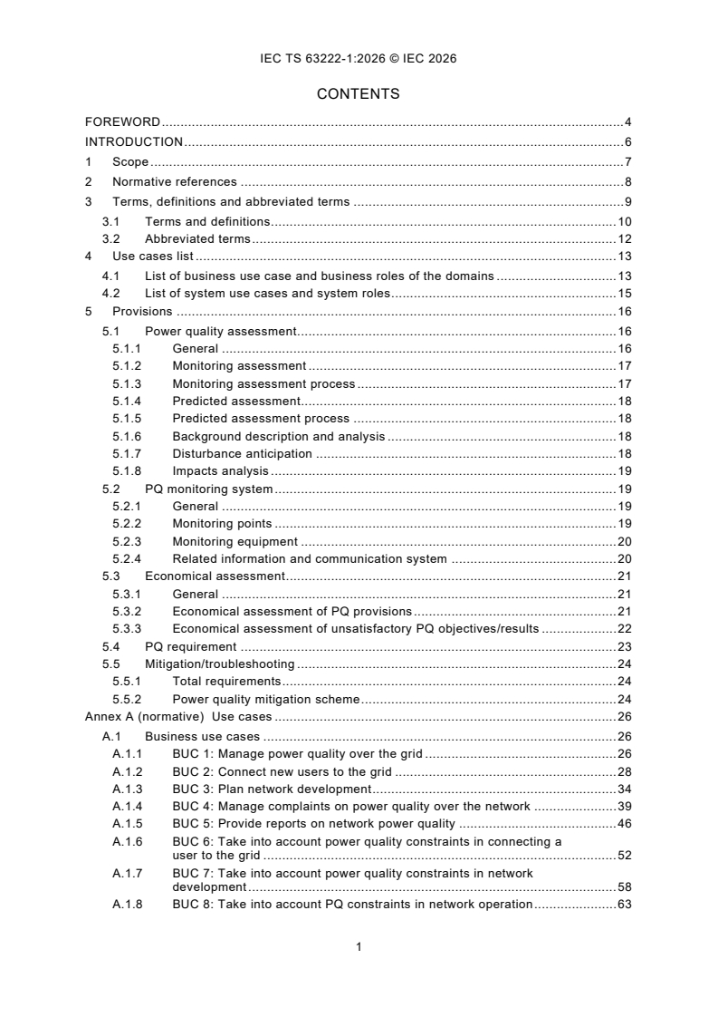 IEC TS 63222-1:2026 is intended to provide provisions associated to the main use cases regarding recognized engineering practices applicable to power quality management in public electric power supply networks. It summarizes the operation in power quality management and investigates the current standards, for requirement of power quality assessment work, as well as to promote the development of power quality management best practices. The power quality management domain groups use cases and associated power quality requirement common to network management, including customer support network operation, network and extension planning. This document captures possible "common and repeated usage" of power quality management under the format of "use case". Use case implementations are given for information purpose only. This document derives the common requirement as provisions by further standardization activities, in terms of actors interacting with the given system. The interface requirement is considered for later standardization activities. The relationship of the stakeholders in power quality management, such as network operator, network user, etc, are discussed in the document. This second edition cancels and replaces the first edition published in 2022. This edition includes the following significant technical changes with respect to the previous edition: - this document completes the use cases planned in IEC 63222-1:2022: four business use cases and three system use cases are added; - this document makes adjustments to the wording of certain phrases and technical details in IEC 63222-1:2022.