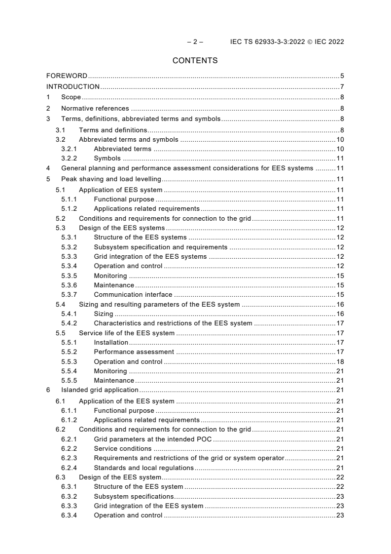 IEC TS 62933-3-3:2022 is a technical specification published by the International Electrotechnical Commission (IEC). Its full title is "Electrical energy storage (EES) systems - Part 3-3: Planning and performance assessment of electrical energy storage systems - Additional requirements for energy intensive and backup power applications". This standard covers: IEC TS 62933-3-3:2022 provides requirements, guidelines and references when EES systems are designed, controlled and operated for energy intensive, islanded grid and backup power supply applications. In energy intensive applications, the EES system provides long charge and discharge phases at variable powers to the supported grid or user equipment. In islanded operation, the EES system provides energy to the islanded grid and coordinates other power generation systems in the islanded grid. In backup power supply and emergency support, the EES system provides energy to the internal grid or a set of emergency loads when the main grid power supply is not available.
