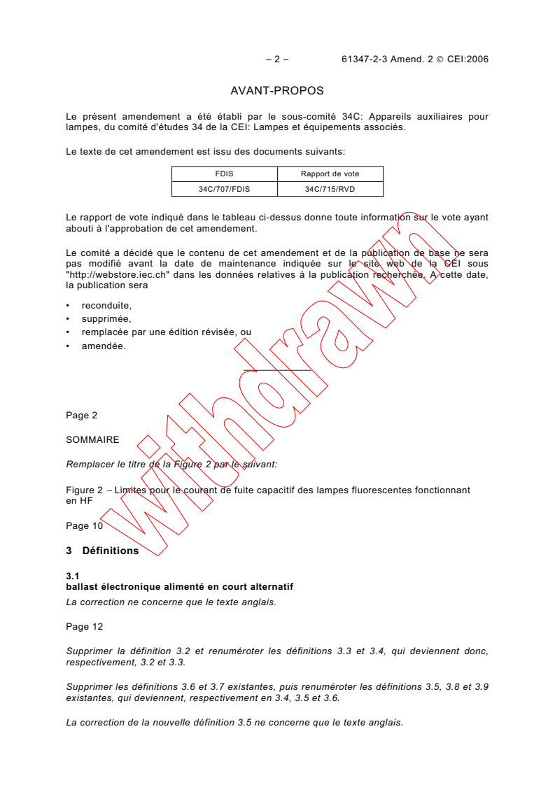 Amendement 2 - Appareillages de lampes - Partie 2-3: Prescriptions particulières pour les ballasts électroniques alimentés en courant alternatif pour lampes fluorescentes