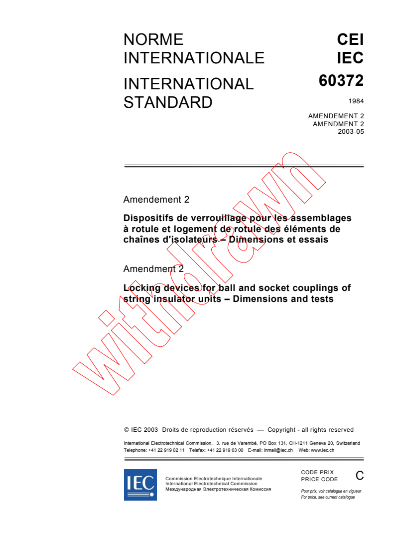 IEC 60372:1984/AMD2:2003 is a standard published by the International Electrotechnical Commission (IEC). Its full title is "Amendment 2 - Locking devices for ball and socket couplings of string insulator units - Dimensions and tests". This standard covers: Amendment 2 - Locking devices for ball and socket couplings of string insulator units - Dimensions and tests