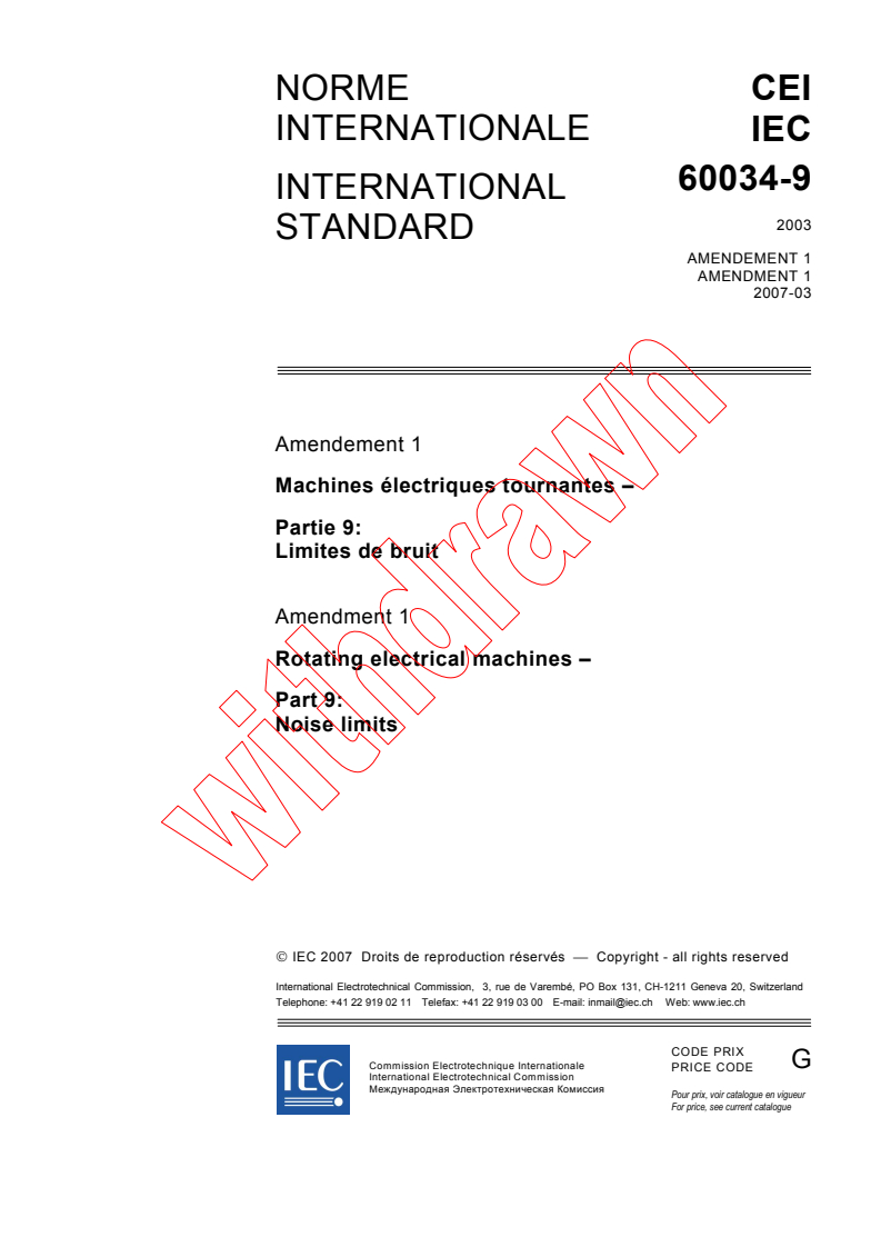 IEC 60034-9:2003/AMD1:2007 is a standard published by the International Electrotechnical Commission (IEC). Its full title is "Amendment 1 - Rotating electrical machines - Part 9: Noise limits". This standard covers: Amendment 1 - Rotating electrical machines - Part 9: Noise limits