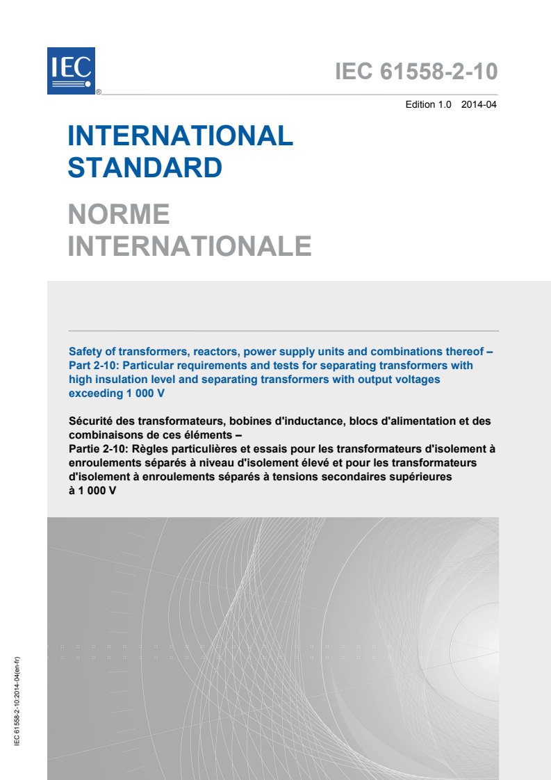 IEC 61558-2-10:2014 is an international standard developed by the International Electrotechnical Commission (IEC) that sets the safety requirements for separating transformers with a high insulation level and those with output voltages exceeding 1,000 V. This standard extends coverage to transformers incorporating electronic circuits as well as power supply units. It replaces the earlier IEC 60989 standard from 1991, providing a comprehensive technical revision aligned with IEC 61558-1:2005.