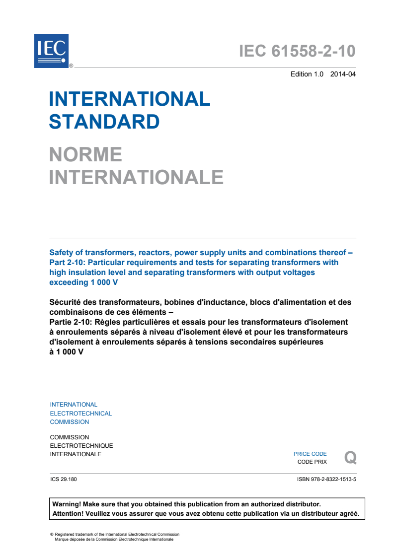IEC 61558-2-10:2014 - Safety of transformers, reactors, power supply units and combinations thereof - Part 2-10: Particular requirements and tests for separating transformers with high insulation level and separating transformers with output voltages exceeding 1 000 V Released:4/10/2014
