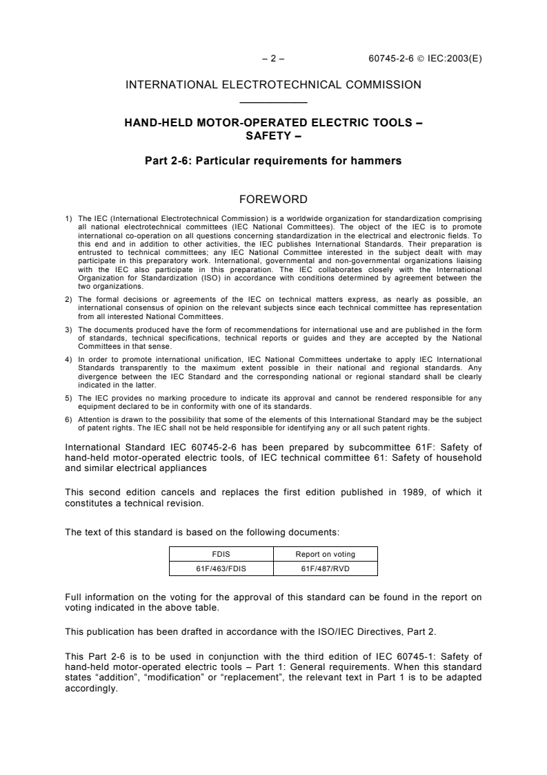 IEC 60745-2-6:2003 - Hand-held motor-operated electric tools - Safety - Part 2-6: Particular requirements for hammers Released:1/27/2003 Isbn:2831864836