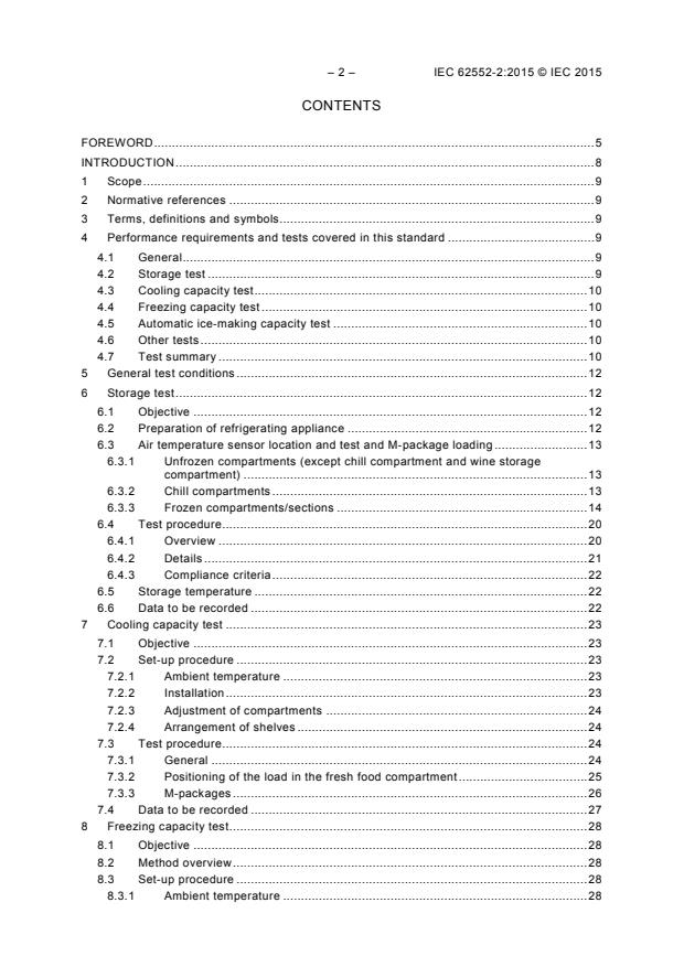 IEC 62552-2:2015 specifies the essential characteristics of household refrigerating appliances cooled by internal natural convection or forced air circulation, and specifies test methods for checking the characteristics. This part of IEC 62552 describes the methods for the determination of performance requirements. Although there is some commonality in the set-ups for different tests (and so it may be an advantage to apply them all to one sample), these are separate tests to evaluate specific characteristics of the sample being tested. This part of IEC 62552 does not specify a procedure to generalise the results from sample test results to a prediction of the characteristics of the whole population from which that sample was selected. IEC 62552-1, IEC 62552-2 and IEC 62552-3 cancel and replace the first edition of IEC 62552 published in 2007. IEC 62552-1, IEC 62552-2 and IEC 62552-3 together constitute a technical revision and include the following significant technical changes with respect to IEC 62552:2007: