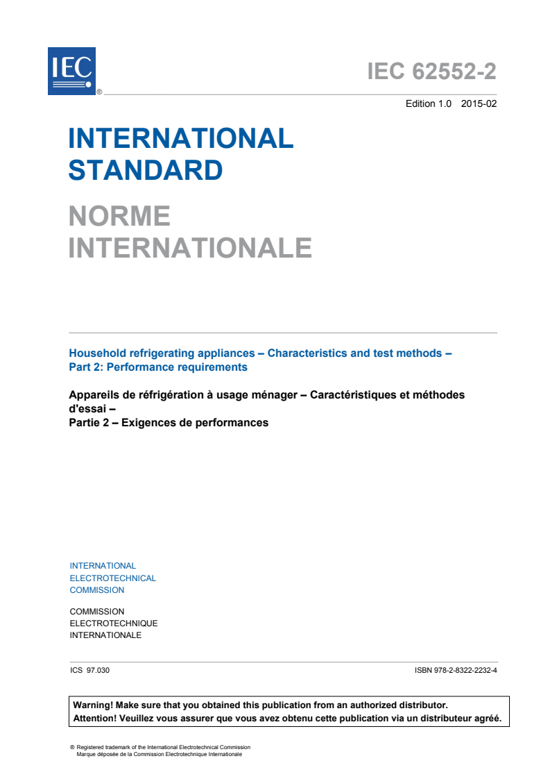 IEC 62552-2:2015 - Household refrigerating appliances - Characteristics and test methods - Part 2: Performance requirements Released:2/13/2015