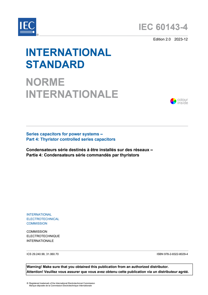 IEC 60143-4:2023 is a standard published by the International Electrotechnical Commission (IEC). Its full title is "Series capacitors for power systems - Part 4: Thyristor controlled series capacitors". This standard covers: IEC 60143-4:2023 specifies the testing of thyristor controlled series capacitor (TCSC) installations used in series with transmission lines. This document also addresses issues that consider ratings for TCSC thyristor valve assemblies, capacitors, and reactors as well as TCSC control characteristics, protective features, cooling system and system operation. IEC 60143-4:2023 cancels and replaces the first edition published in 2010. This edition constitutes a technical revision. This edition includes the following significant technical changes with respect to the previous edition: a) thyristor valve testing requirements refer to IEC 62823; b) Formula (1) in Subclause 4.2 has been corrected; c) Hardware-in-the-loop (HIL) tests, Subclause 7.5.4, replaces previously specified real time protection and control system test with network simulator.