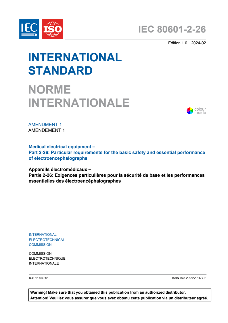 IEC 80601-2-26:2019/AMD1:2024 is a standard published by the International Electrotechnical Commission (IEC). Its full title is "Amendment 1 - Medical electrical equipment - Part 2-26: Particular requirements for the basic safety and essential performance of electroencephalographs". This standard covers: Amendment 1 - Medical electrical equipment - Part 2-26: Particular requirements for the basic safety and essential performance of electroencephalographs