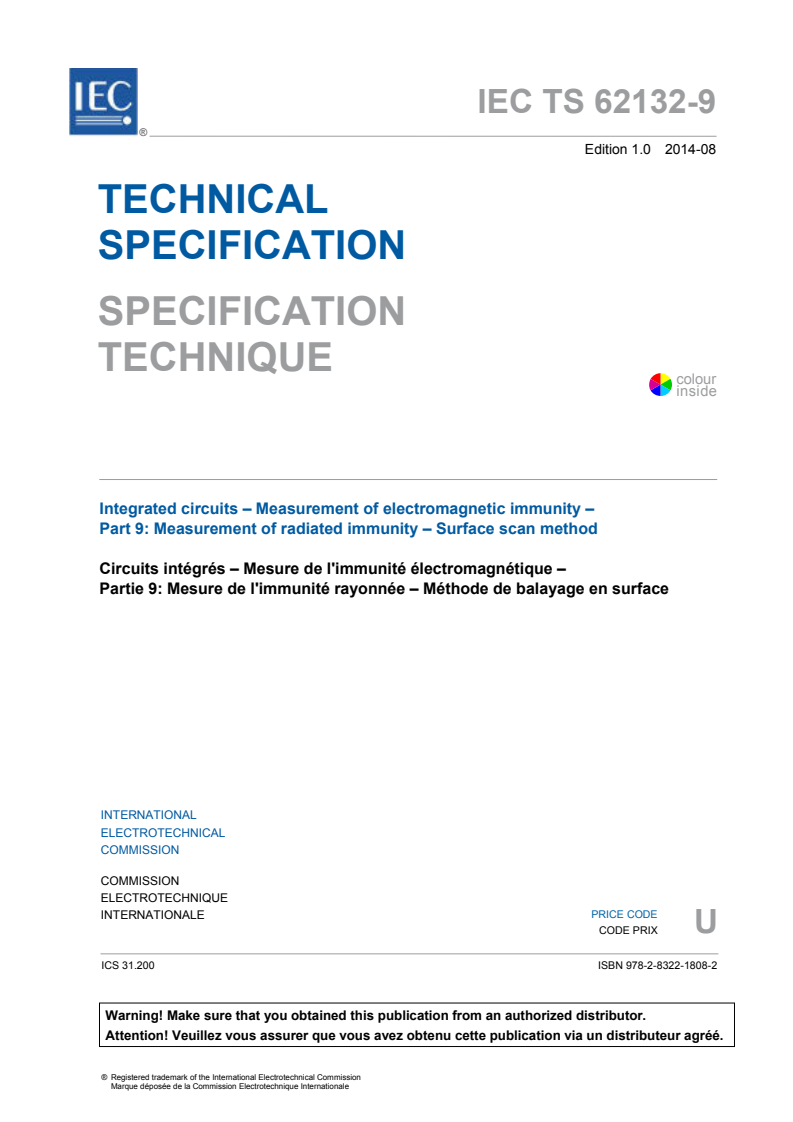 IEC TS 62132-9:2014 - Integrated circuits - Measurement of electromagnetic immunity - Part 9: Measurement of radiated immunity - Surface scan method Released:8/21/2014