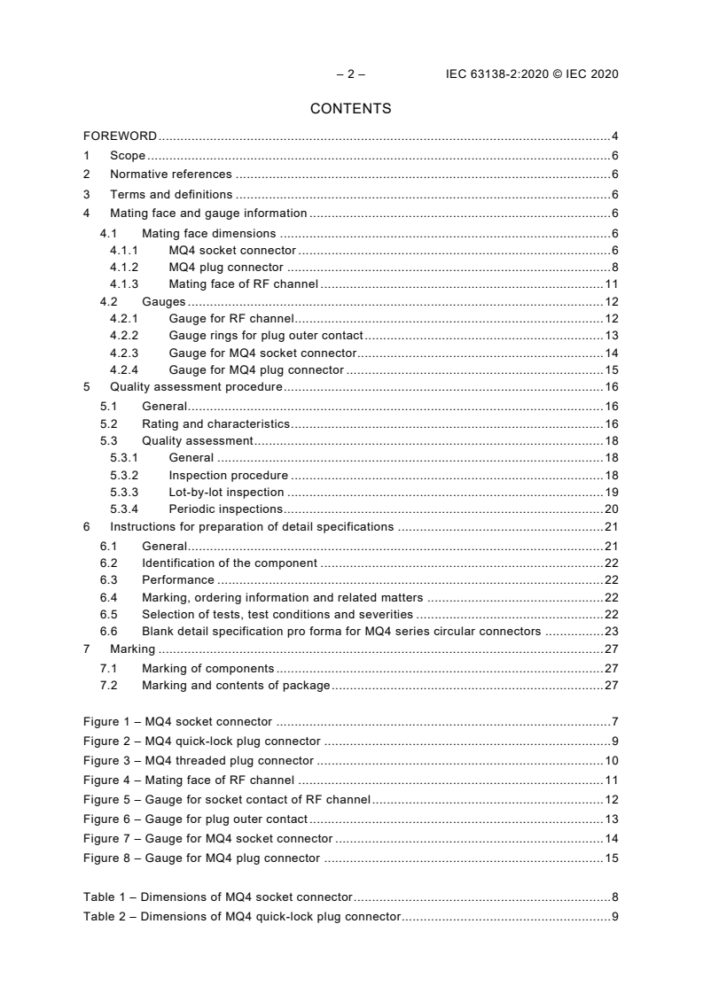 IEC 63138-2:2020, which is a sectional specification (SS), provides information and rules for the preparation of detail specifications (DS) for MQ4 series circular connectors with four RF channels, as well as a detailed specification of the blank format. An MQ4 series circular connector with 50 Ω nominal impedance has four RF channels which can be engaged and disengaged at the same time. There are two versions of plug connectors, one is a quick-lock version, and the other is a threaded version. The socket connector provides two coupling mechanisms, a quick-lock and a threaded coupling.