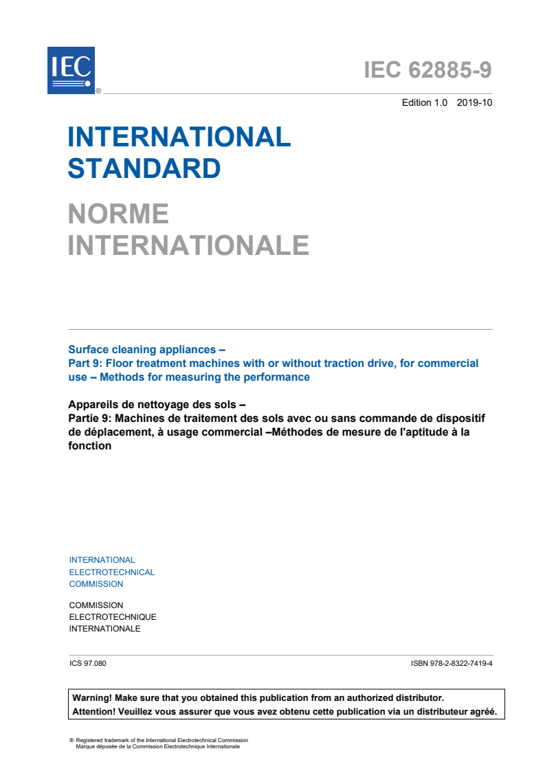 IEC 62885-9:2019 lists the characteristic performance parameters for walk-behind and ride-on floor scrubbers and sweepers and other floor cleaning machines in accordance with IEC 60335-2-72:2016.