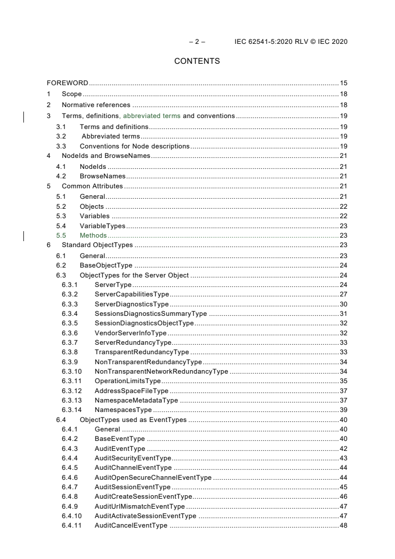 IEC 62541-5:2020 is a standard published by the International Electrotechnical Commission (IEC). Its full title is "OPC Unified Architecture - Part 5: Information Model". This standard covers: IEC 62541-5:2020 defines the Information Model of the OPC Unified Architecture. The Information Model describes standardized Nodes of a Server’s AddressSpace. These Nodes are standardized types as well as standardized instances used for diagnostics or as entry points to server-specific Nodes. Thus, the Information Model defines the AddressSpace of an empty OPC UA Server. However, it is not expected that all Servers will provide all of these Nodes. This third edition cancels and replaces the second edition published in 2015. This edition constitutes a technical revision. This edition includes the following significant technical changes with respect to the previous edition: a) Added Annex F on User Authentication. Describes the Role Information Model that also allows configuration of Roles. b) Added new data types: "Union", "Decimal", "OptionSet", "DateString", "TimeString", "DurationString", NormalizedString", "DecimalString", and "AudioDataType". c) Added Method to request a state change in a Server. d) Added Method to set Subscription to persistent mode. e) Added Method to request resending of data from a Subscription. f) Added concept allowing to temporarily create a file to write to or read from a server in C.4. g) Added new Variable type to support Selection Lists. h) Added optional properties to FiniteStateMachineType to expose currently available states and transitions. i) Added UrisVersion Property to ServerType. This version information can be used for session-less service invocation.