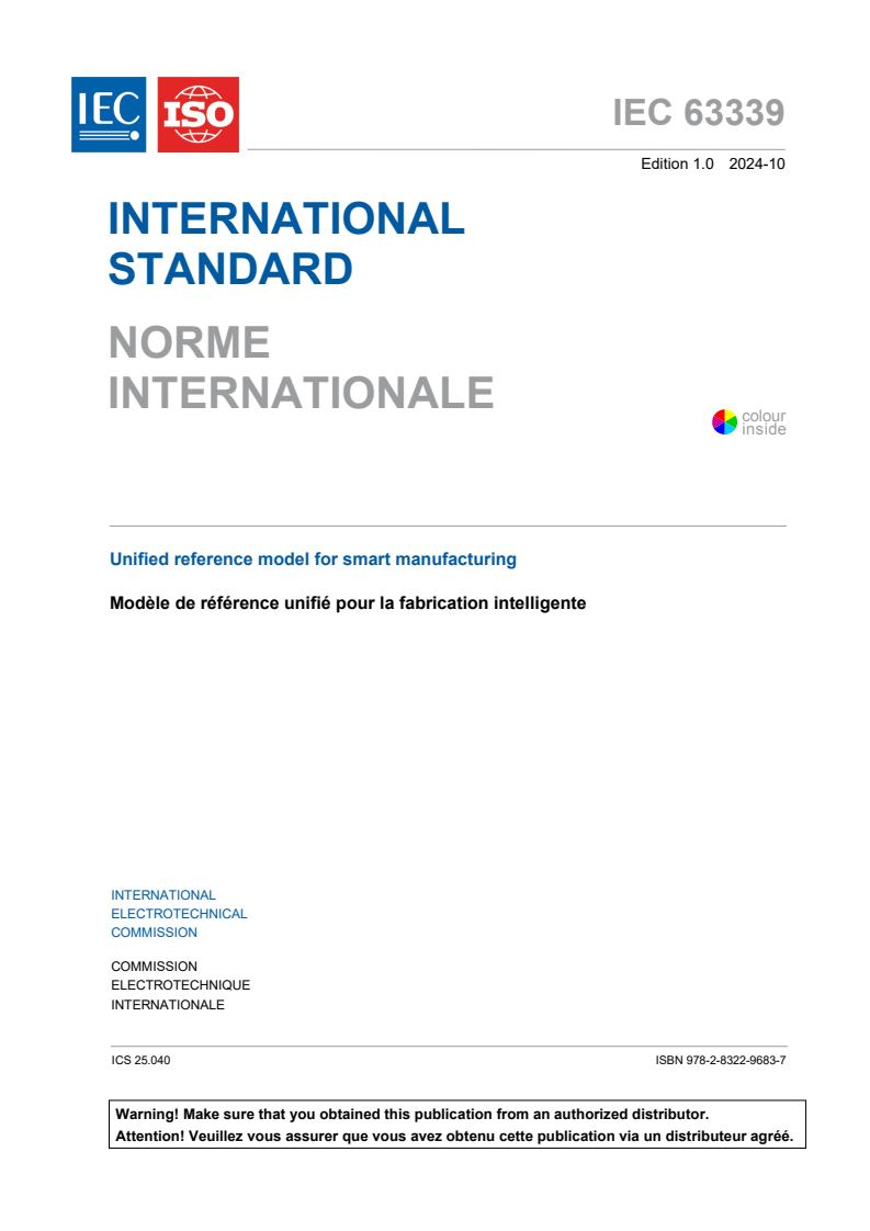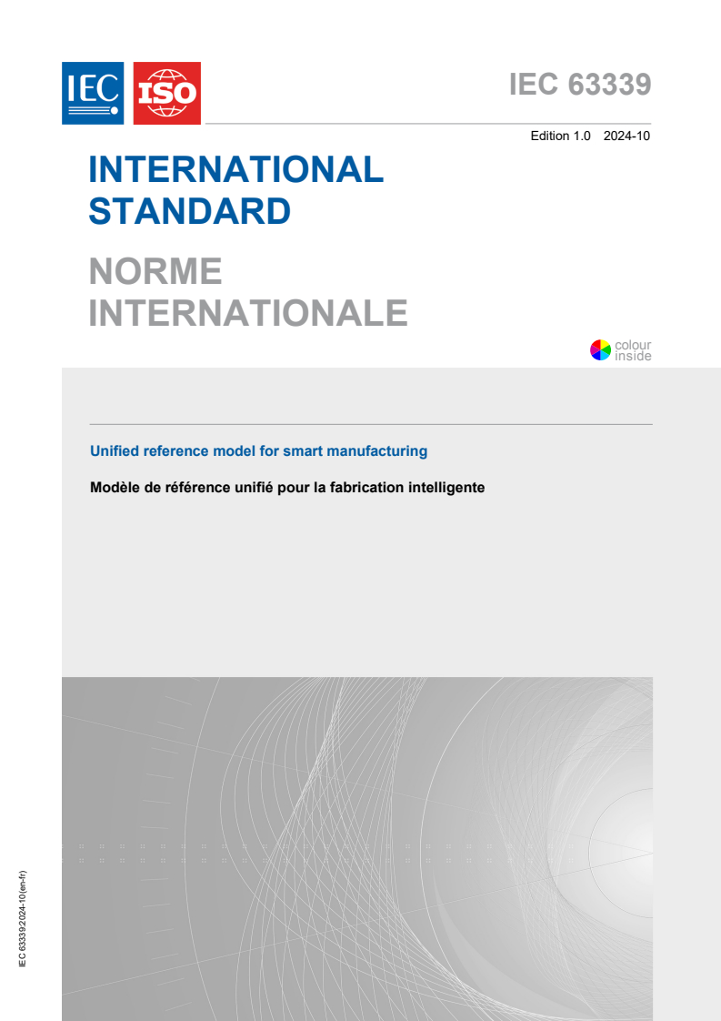 IEC 63339:2024 defines the Unified Reference Model for Smart Manufacturing (URMSM), establishing a standardized terminology and structural framework to advance smart manufacturing. This standard provides a comprehensive set of common modelling elements, their associations, and conformance criteria aimed at supporting the development and specialization of reference models throughout manufacturing systems. Covering product, production, and lifecycle aspects, the URMSM promotes a coherent approach to represent complex smart manufacturing ecosystems.