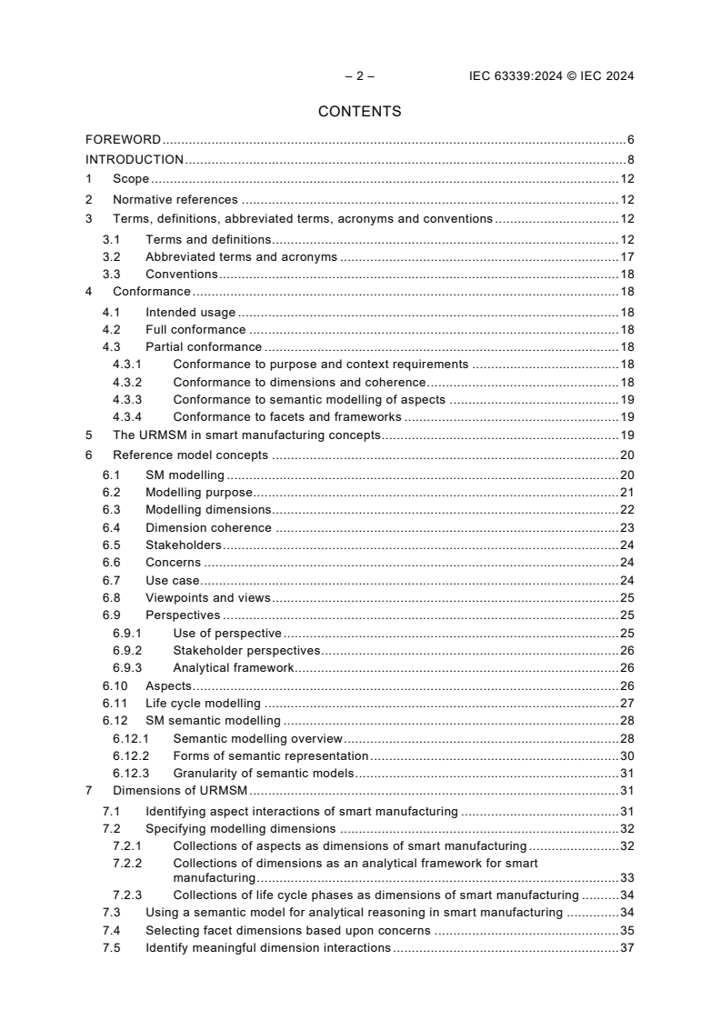 IEC 63339:2024 specifies the unified reference model for smart manufacturing (URMSM) using a terminology and structure, and establishes criteria for creating reference models, as specializations, that support smart manufacturing. The terminology and structure comprise a set of common modelling elements, their associations, and conformance criteria. These common modelling elements address aspects and perspectives of products and production and their lifecycle considerations. The URMSM enables an approach for creating multiple models based upon a reference model that is sufficient for understanding significant relationships among entities involved in smart manufacturing (SM) and for the development of standards and other specifications. The URMSM specifications in this document accommodate consistent, coherent, compatible specializations for relevant aspects of manufacturing systems consisting of equipment, products, and services within the domain of manufacturing. Provisions of this document are applicable for a new smart manufacturing reference model (SMRM) or elaboration of existing SMRM capabilities, for example, improving capabilities for analysis of opportunities and synthesis of technological advances, and improving interoperability of new and existing systems. This document is not intended to prescribe interoperability considerations or data schemas of models. Standardization of content relative to models will be the subject of other standards and texts specific to those model domains.