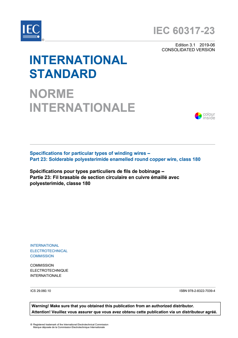 IEC 60317-23:2013 specifies the requirements of solderable enamelled round copper winding wire of class 180 with a sole coating based on polyesterimide resin, which may be modified providing it retains the chemical identity of the original resin and meets all specified wire requirements. NOTE - A modified resin is a resin that has undergone a chemical change, or contains one or more additives to enhance certain performance or application characteristics. The range of nominal conductor diameters covered by this standard is: