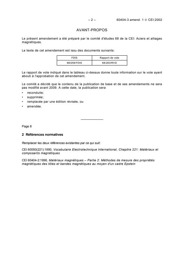 It updates key normative references, specifically IEC 60050(221):1990 for magnetic materials vocabulary and IEC 60404-2:1996 for Epstein frame testing methods, ensuring alignment with the latest international terminology and test procedures.