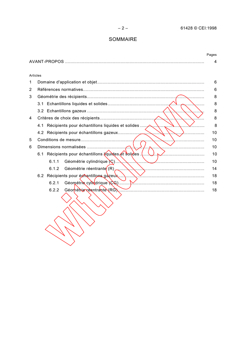 S'applique aux récipients contenant les échantillons liquides, solides ou gazeux utilisés en spectrométrie gamma quantitative avec les détecteurs germanium refroidis. Spécifie le volume, les dimensions et les caractéristiques physiques des récipients, les volumes desquels variant entre 50 et 3000 cm cube.