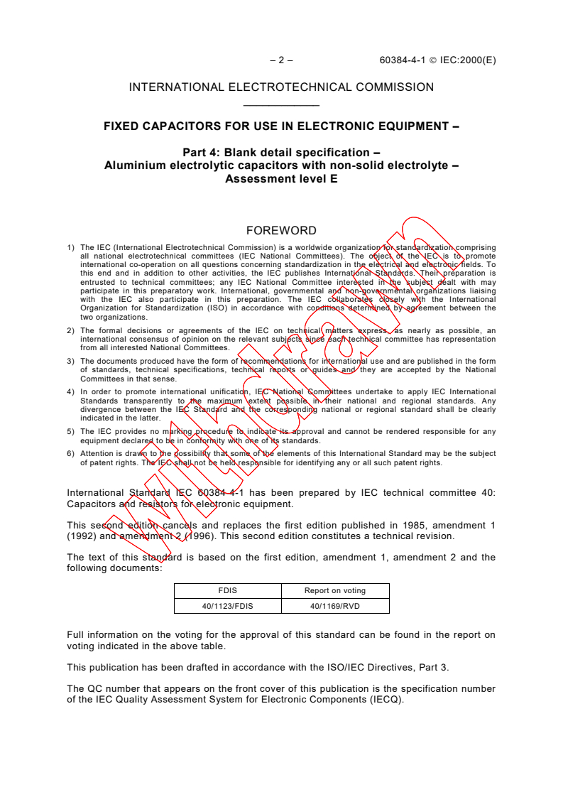IEC 60384-4-1:2000 is the IEC blank detail specification for aluminium electrolytic capacitors with non‑solid (wet) electrolyte, published as Part 4 of the IEC 60384 series. It defines the required style, layout and minimum content for product detail specifications used with the sectional specification IEC 60384-4 and the generic specification IEC 60384-1. This second edition (2000) is issued under the IEC Quality Assessment System (IECQ) reference QC 300301 and targets Assessment Level E.