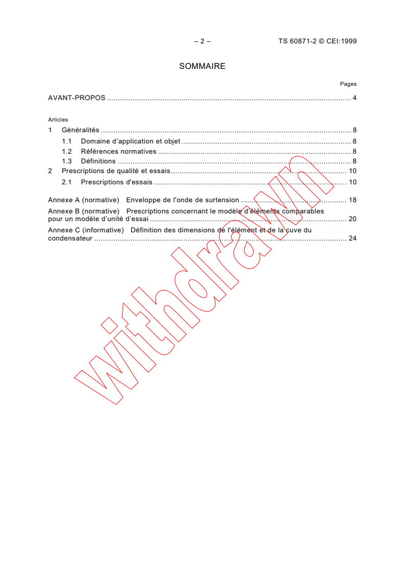 Detailed overvoltage waveform envelopes and aging test cycles are defined, with annexes providing guidance on comparable element modeling and physical dimensions for elements and containers.Test Methodology
