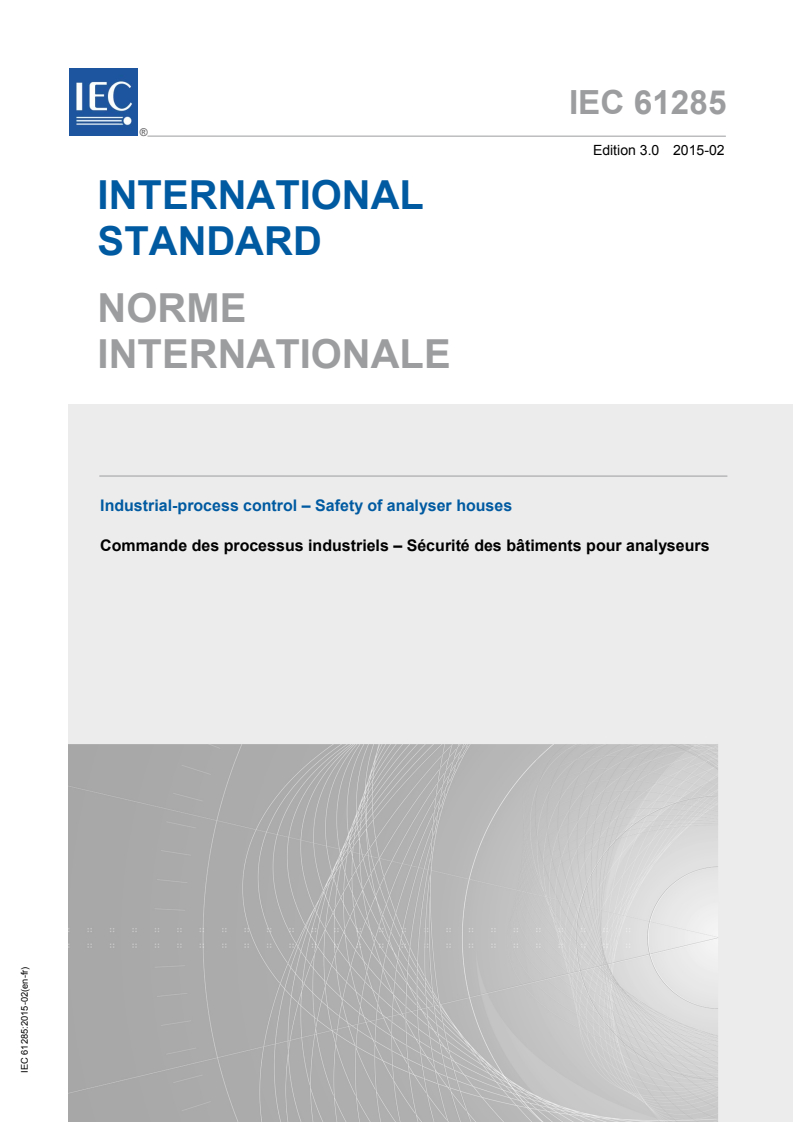 IEC 61285:2015 is a standard published by the International Electrotechnical Commission (IEC). Its full title is "Industrial-process control - Safety of analyser houses". This standard covers: IEC 61285:2015 describes the physical requirements for the safe operation of the process analyser measuring system installed in an analyser house (AH) in order to ensure its protection against fire, explosion and health hazards. This standard applies for analyser houses with inner and/or external potential explosive atmospheres and it applies to hazards caused by toxic substances or asphyxiant gases. This third edition cancels and replaces the second edition published in 2004 and constitutes a technical revision. The main changes are: - incorporation of previously issued corrigendum and - minor updates to several sections and references.