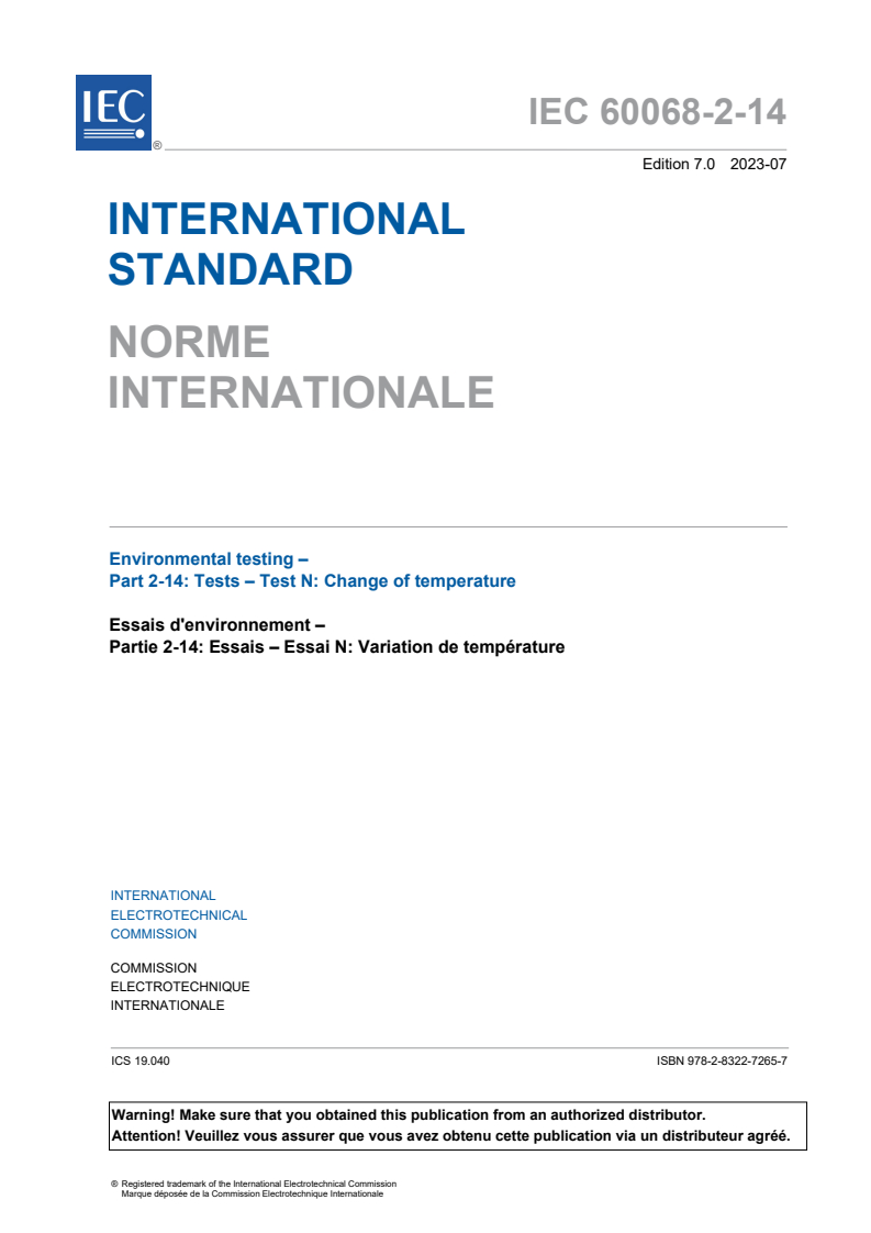 IEC 60068-2-14:2023 - Environmental testing - Part 2-14: Tests - Test N: Change of temperature Released:7/27/2023