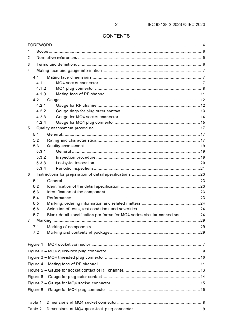 IEC 63138-2:2023 is the sectional specification (SS) for MQ4 series circular connectors, published by the International Electrotechnical Commission (IEC). It complements IEC 63138-1 by providing the information and rules needed to prepare detail specifications (DS) for four‑channel, 50 Ω multi‑channel RF connectors. The document covers mating face dimensions, gauging information, a blank DS pro forma, quality assessment procedures and a selection of tests from IEC 63138-1 applicable to all MQ4 detail specifications.
