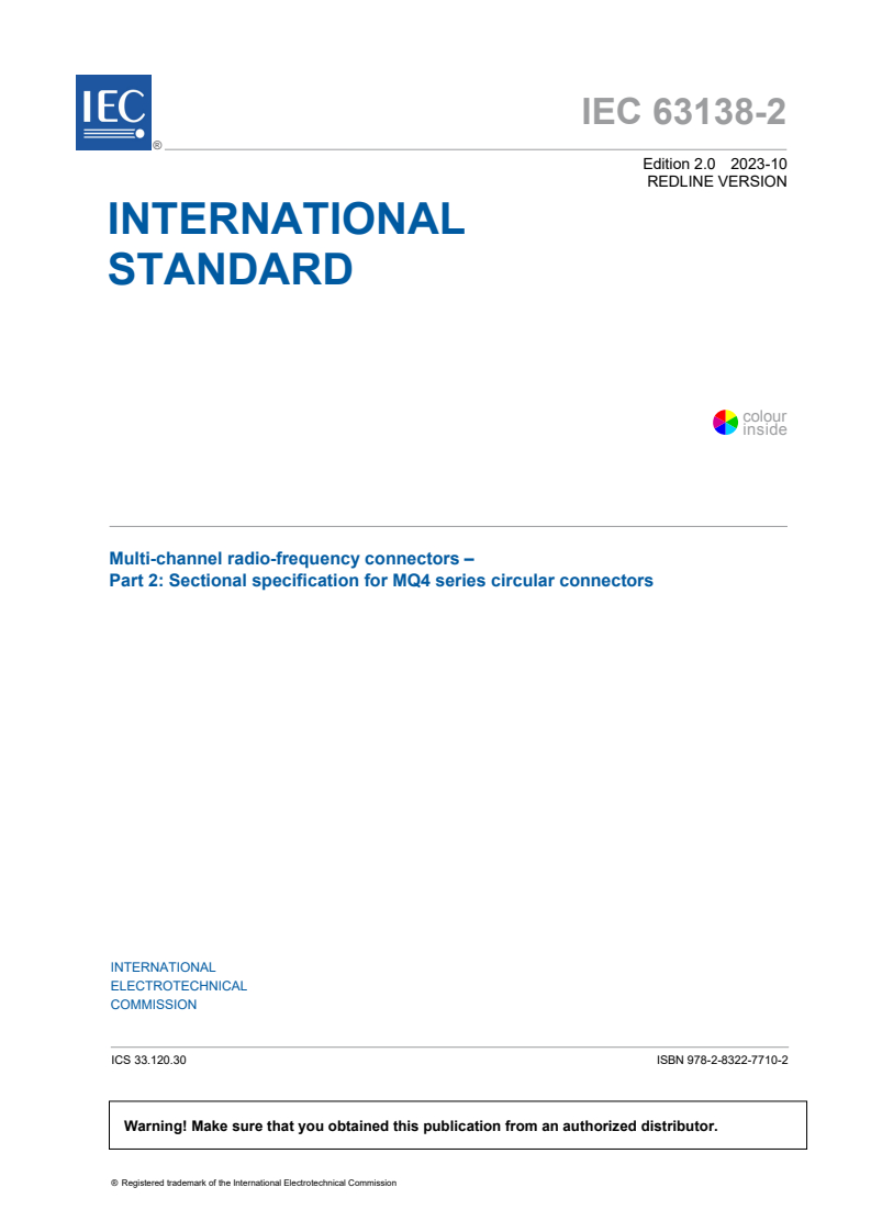 IEC 63138-2:2023 - Multi-channel radio-frequency connectors - Part 2: Sectional specification for MQ4 series circular connectors Released:10/17/2023