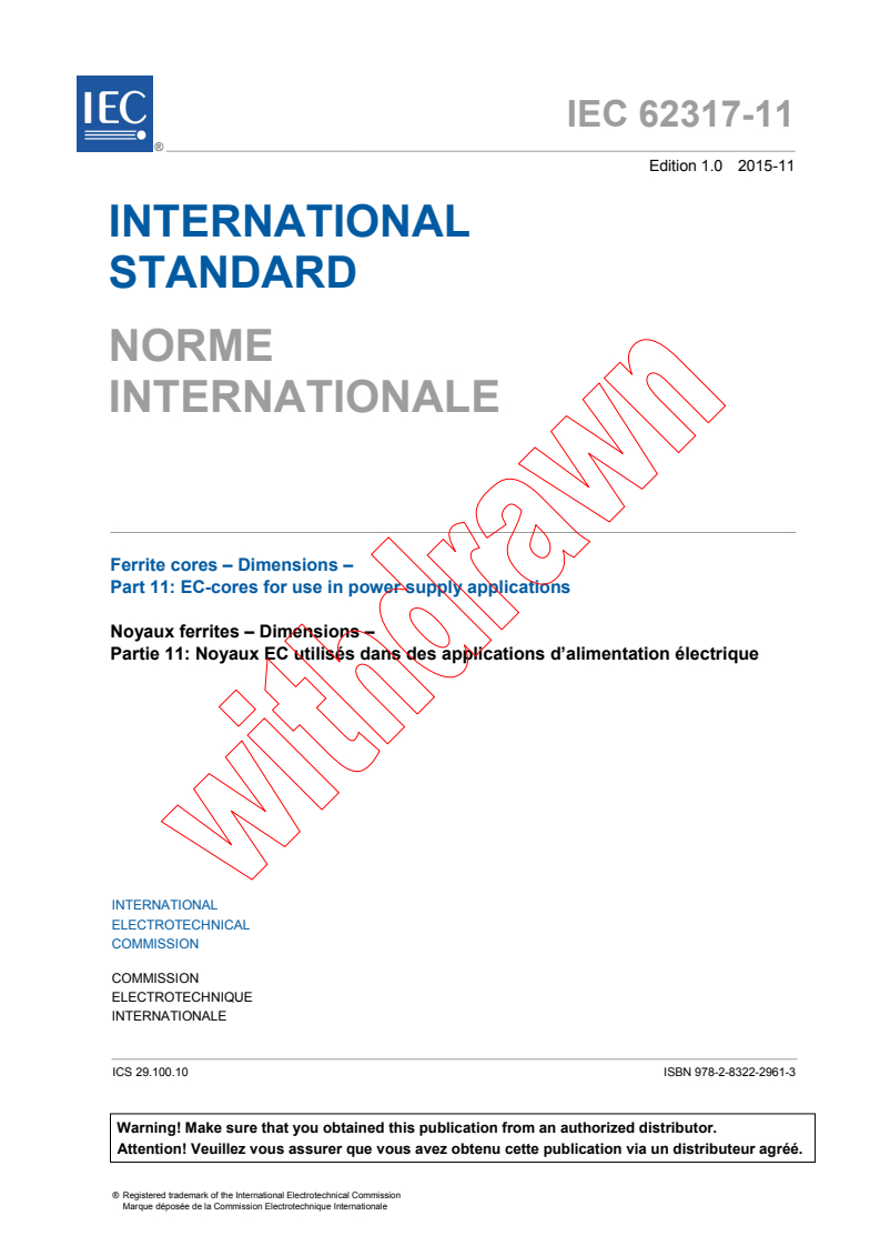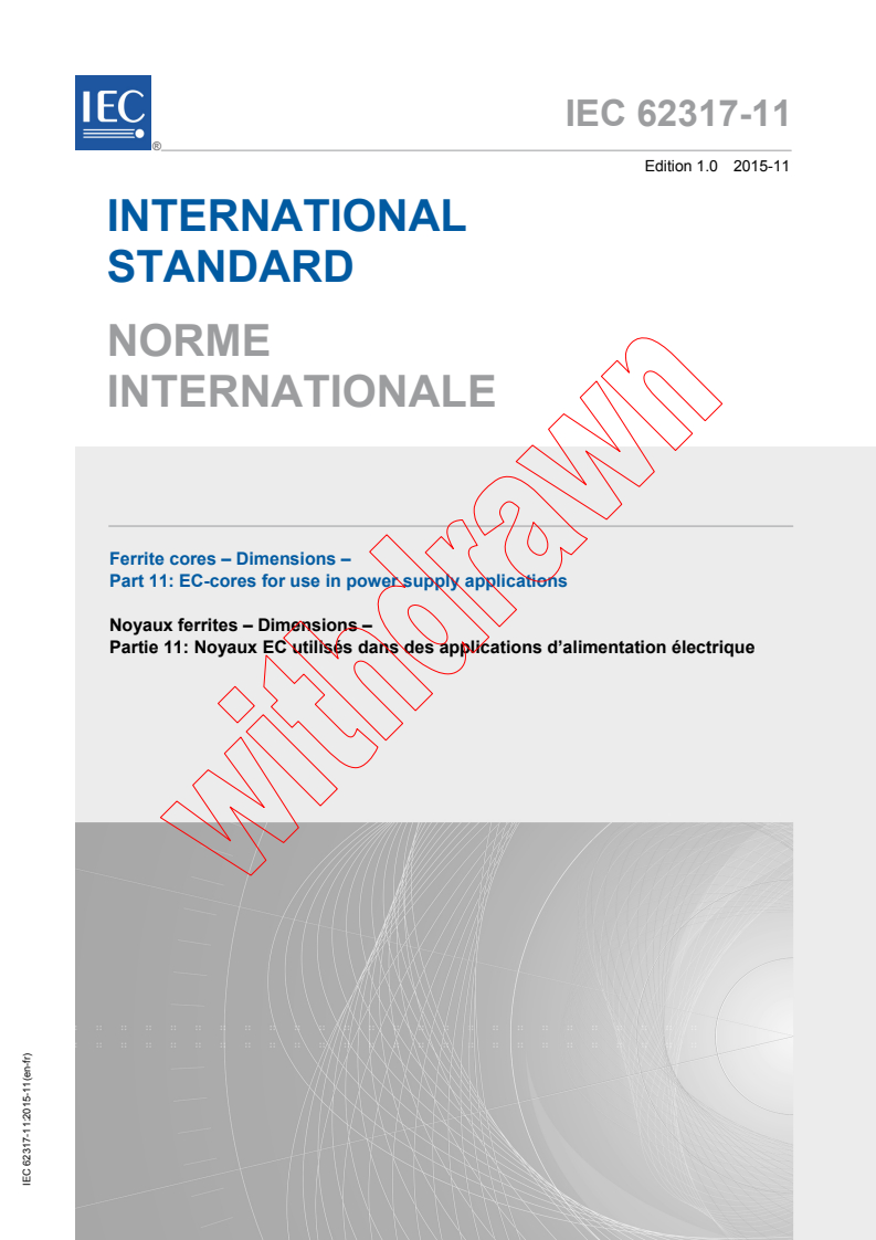 IEC 62317-11:2015 is a standard published by the International Electrotechnical Commission (IEC). Its full title is "Ferrite cores - Dimensions - Part 11: EC-cores for use in power supply applications". This standard covers: IEC 62317-11:2015 specifies the dimensions that are of importance for mechanical interchangeability for a preferred range of EC-cores, the essential dimensions of coil formers to be used with them, and the effective parameter values to be used in calculations involving them. This first edition cancels and replaces the first edition of IEC 60647 published in 1979. This edition constitutes a technical revision and includes the following significant technical changes with respect to the first edition of IEC 60647: - addition of EC90 and EC120 cores in Table 1, - addition of effective parameter and Amin values and main dimensions of coil formers for EC90 and EC120 cores.