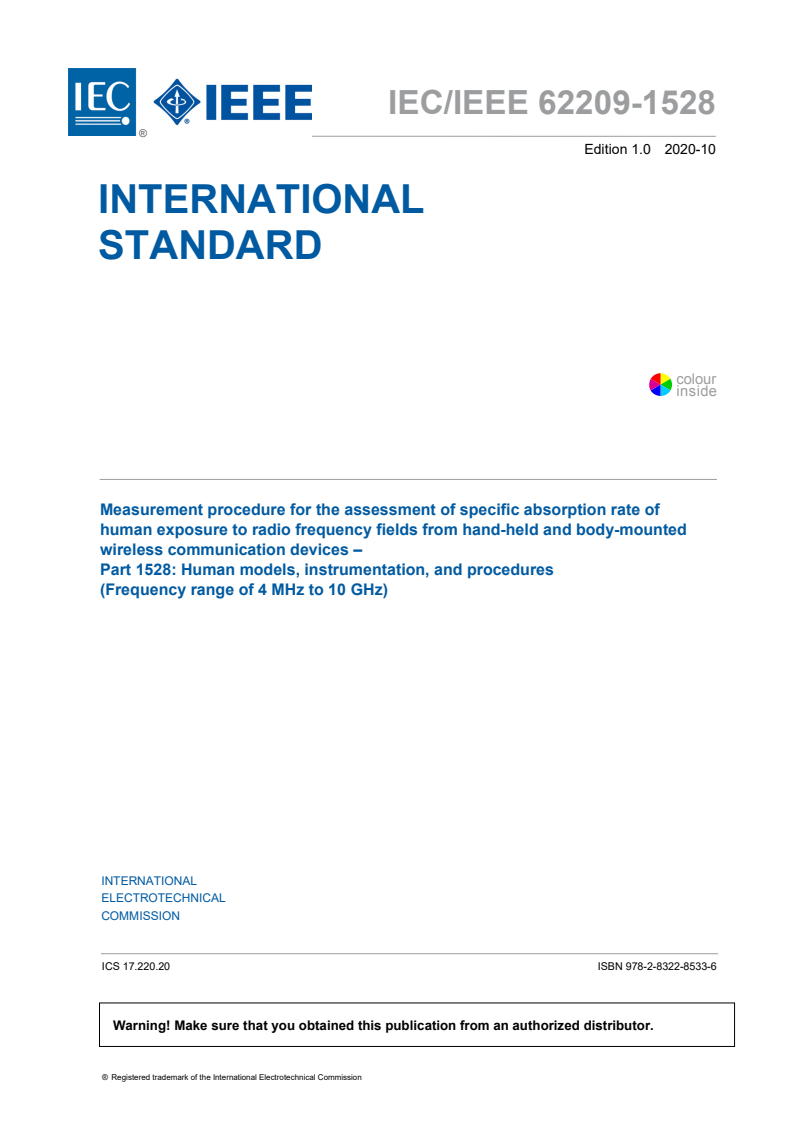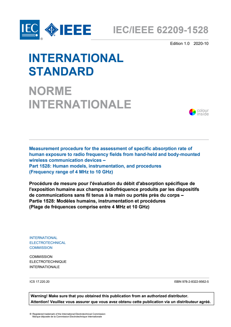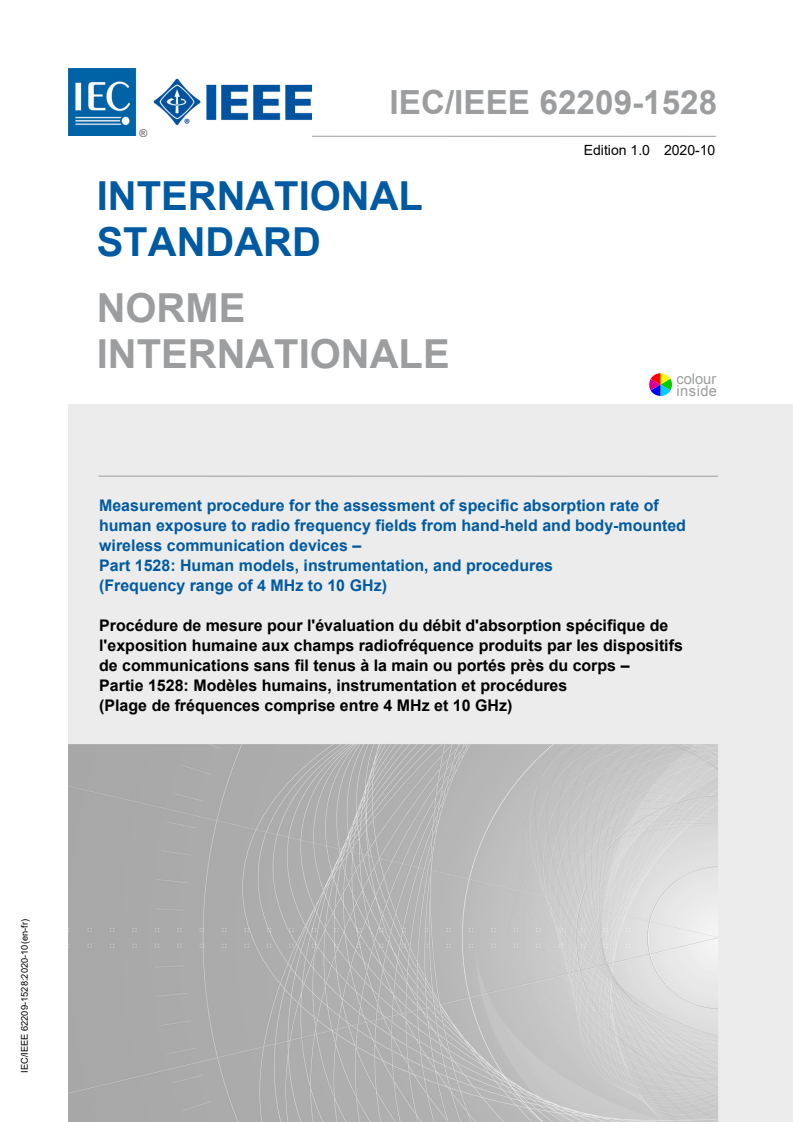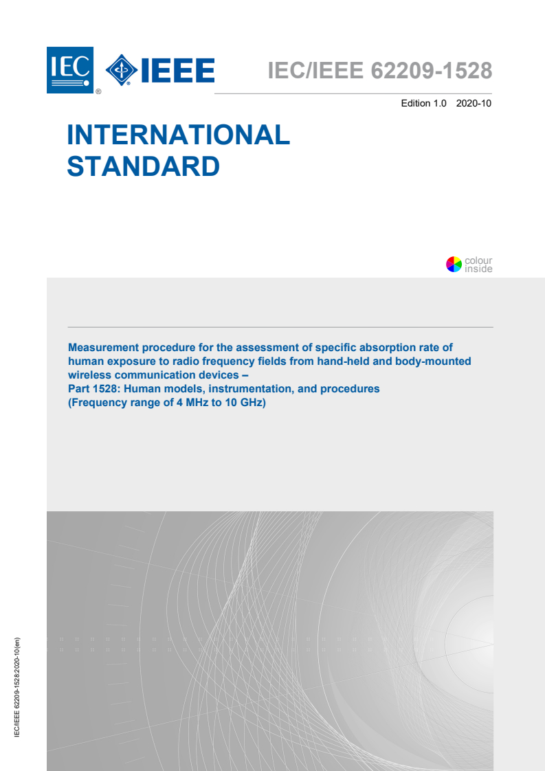 IEC/IEEE 62209-1528:2020 - Measurement procedure for the assessment of specific absorption rate of human exposure to radio frequency fields from hand-held and body-worn wireless communication devices - Human models, instrumentation and procedures (Frequency range of 4 MHz to 10 GHz) Released:10/19/2020