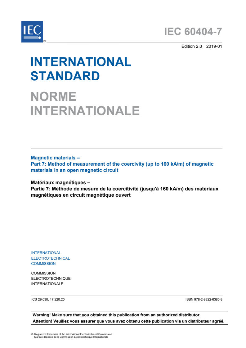 IEC 60404-7:2019 specifies a method of measurement of the coercivity of magnetic materials in an open magnetic circuit. This document is applicable to all magnetic materials with coercivities from 0,2 A/m to 160 kA/m.