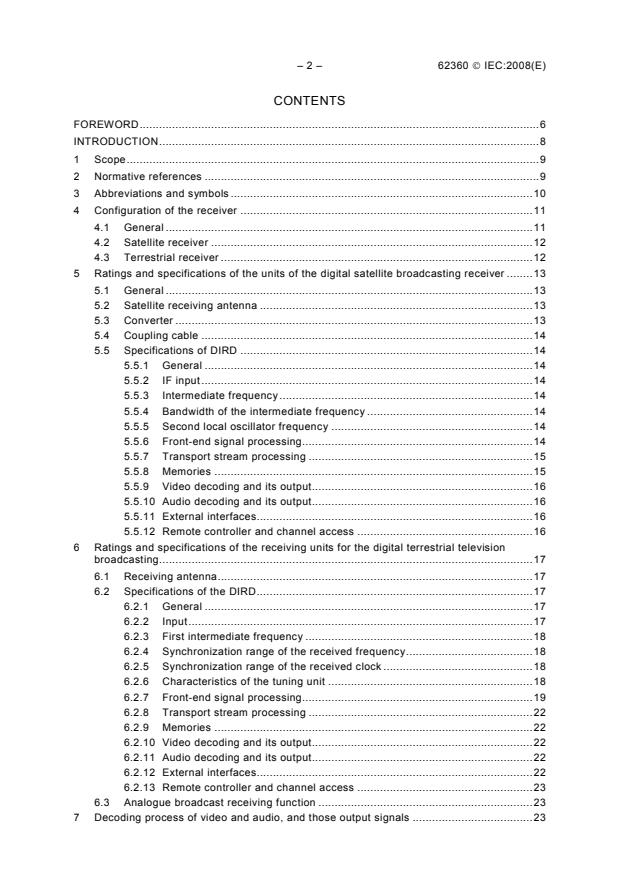 IEC 62360:2008 specifies baseline functions, ratings and performance requirements for satellite and terrestrial receivers used with ISDB (Integrated Services Digital Broadcasting). The standard covers receivers for standard-definition digital TV, high-definition TV (HDTV) and radio broadcasting over satellite (11.7–12.2 GHz and 12.2–12.75 GHz with 34.5 MHz bandwidth where applicable) and for terrestrial ISDB broadcasting (VHF/MID bands). This second edition (2008) updates the 2004 edition with clarified memory requirements, reception channel ranges, digital interfaces and audio down-mix rules.