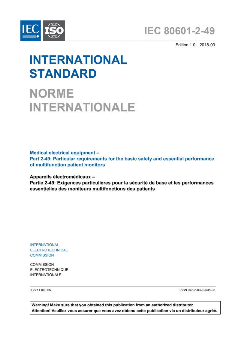 IEC 80601-2-49:2018 - Medical electrical equipment - Part 2-49: Particular requirements for the basic safety and essential performance of multifunction patient monitors Released:3/8/2018