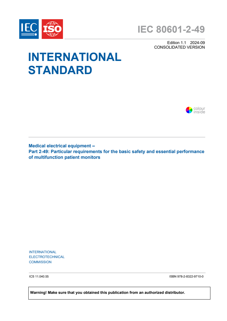 IEC 80601-2-49:2018 is a standard published by the International Electrotechnical Commission (IEC). Its full title is "Medical electrical equipment - Part 2-49: Particular requirements for the basic safety and essential performance of multifunction patient monitors". This standard covers: IEC 80601-2-49:2018 applies to basic safety and essential performance requirements of multifunction patient monitors, hereafter referred to as ME equipment or medical electrical systems. This particular standard applies to multifunction patient monitors intended for use in professional healthcare facilities as well as in the emergency medical service environment or the home healthcare environment. The scope of this document is restricted to ME equipment or medical electrical systems intended for connection to a single patient that has two or more physiological monitoring units. For purposes of this document, a pregnant mother and her fetus(es) are considered a single patient. This document does not specify requirements for individual physiological monitoring units such as ECG, invasive pressure and pulse oximetry. The particular standards related to these physiological monitoring units specify requirements from the perspective of stand-alone ME equipment. This particular standard addresses the additional requirements related to multifunction patient monitors. Multifunction patient monitors can be integrated into other ME equipment or medical electrical systems. When this is the case, other relevant standards also apply. This document does not apply to implantable parts of multifunction patient monitors. This first edition cancels and replaces the second edition of IEC 60601-2-49, published in 2011. This edition constitutes a technical revision to align with the current edition and Amendment to IEC 60601-1, new versions of collateral standards and amendments thereto. Major changes are in Clause 208 because many of the former requirements are now addressed by IEC 60601-1-8.