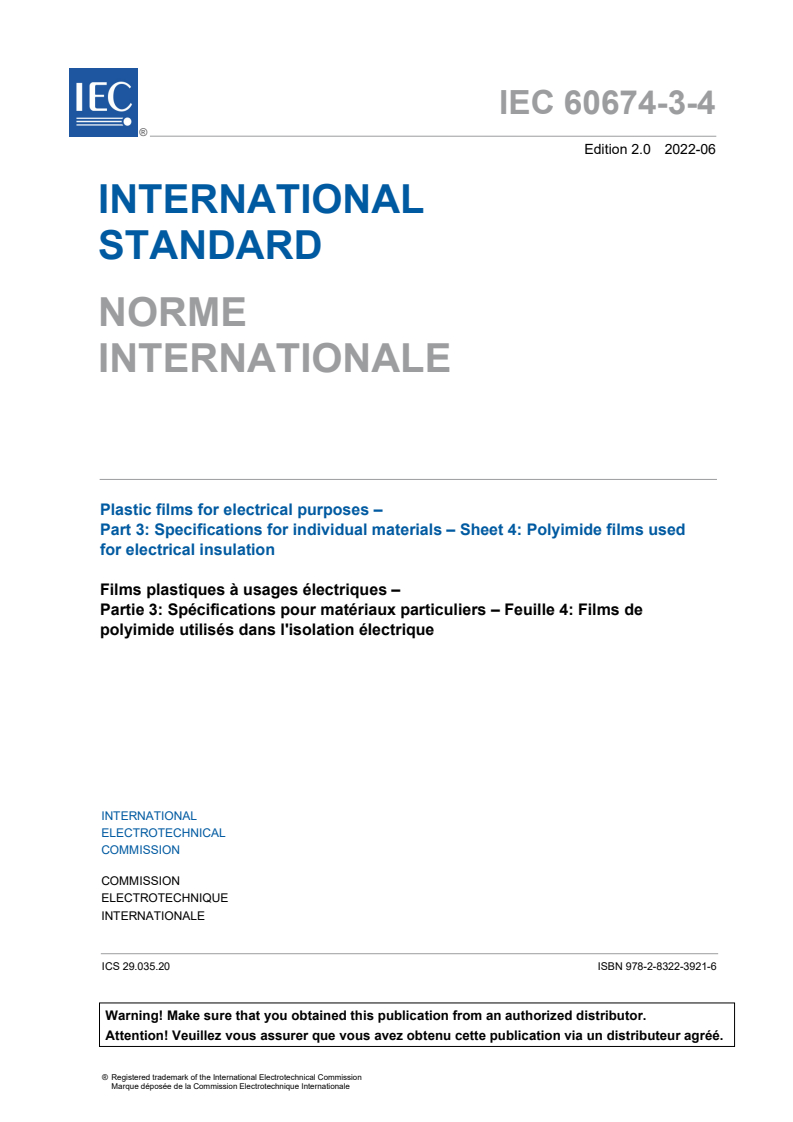 IEC 60674-3-4:2022 - Plastic films for electrical purposes - Part 3: Specifications for individual materials - Sheets 4: Polyimide films used for electrical insulation Released:6/22/2022