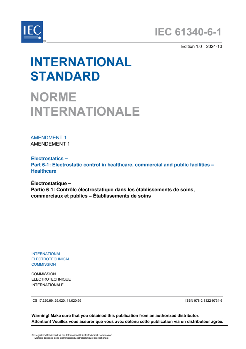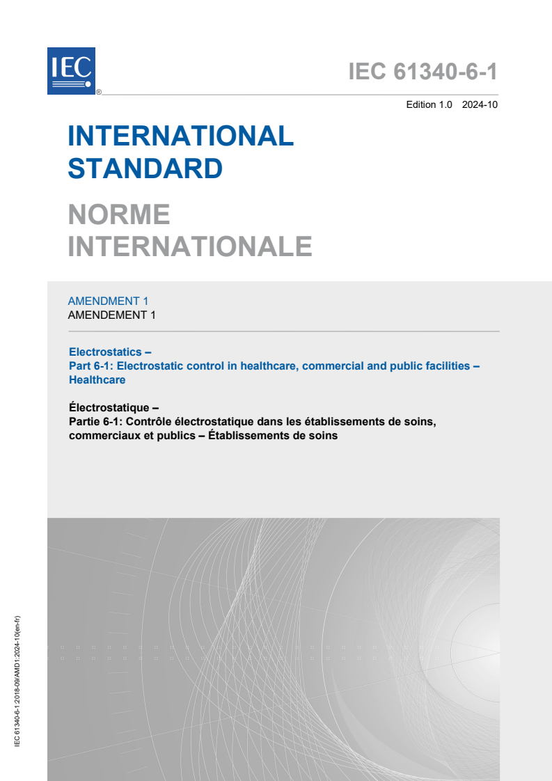 The IEC 61340-6-1:2018/AMD1:2024 Amendment 1 is a critical update to the international standard governing electrostatic control in healthcare, commercial, and public facilities, specifically focusing on healthcare environments. Published by the International Electrotechnical Commission (IEC), this amendment refines and expands guidelines to enhance safety and performance regarding electrostatic phenomena in sensitive medical locations.