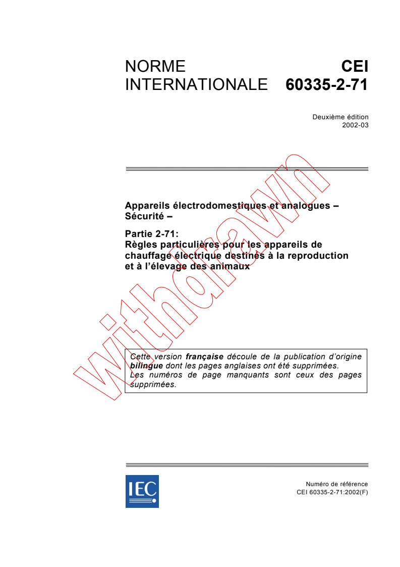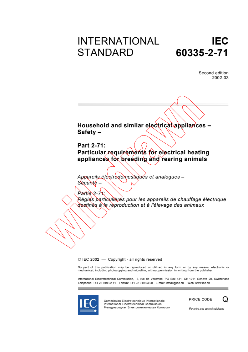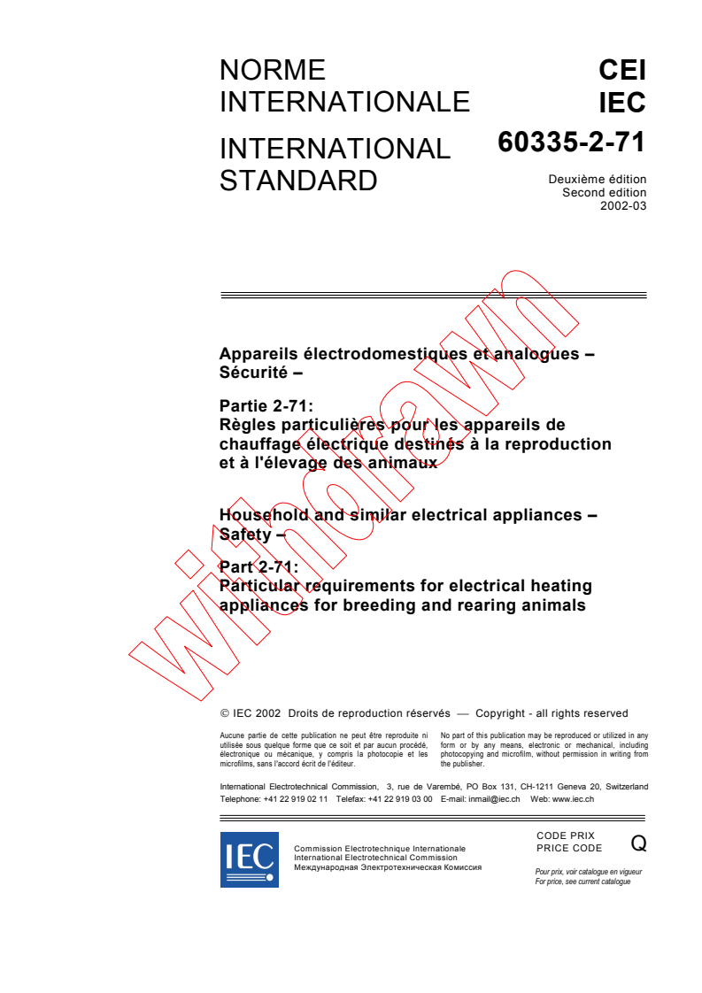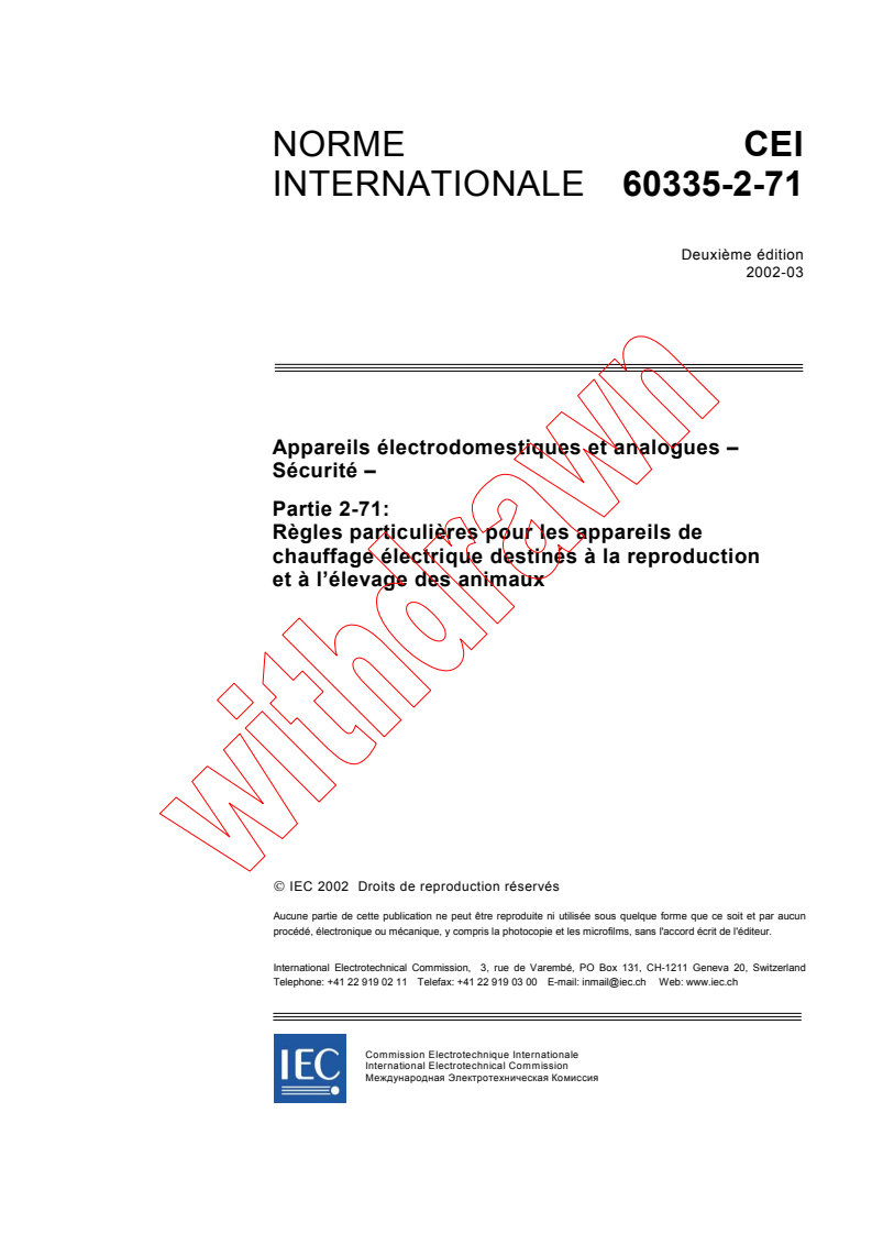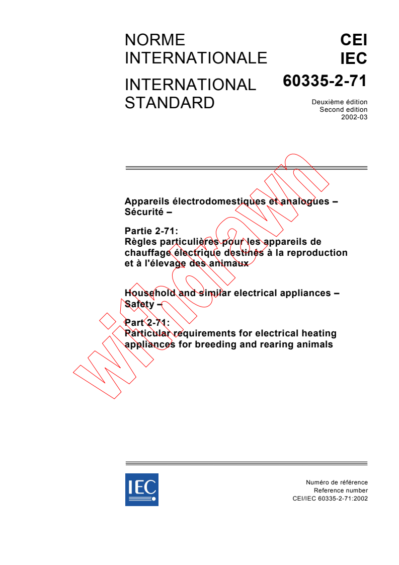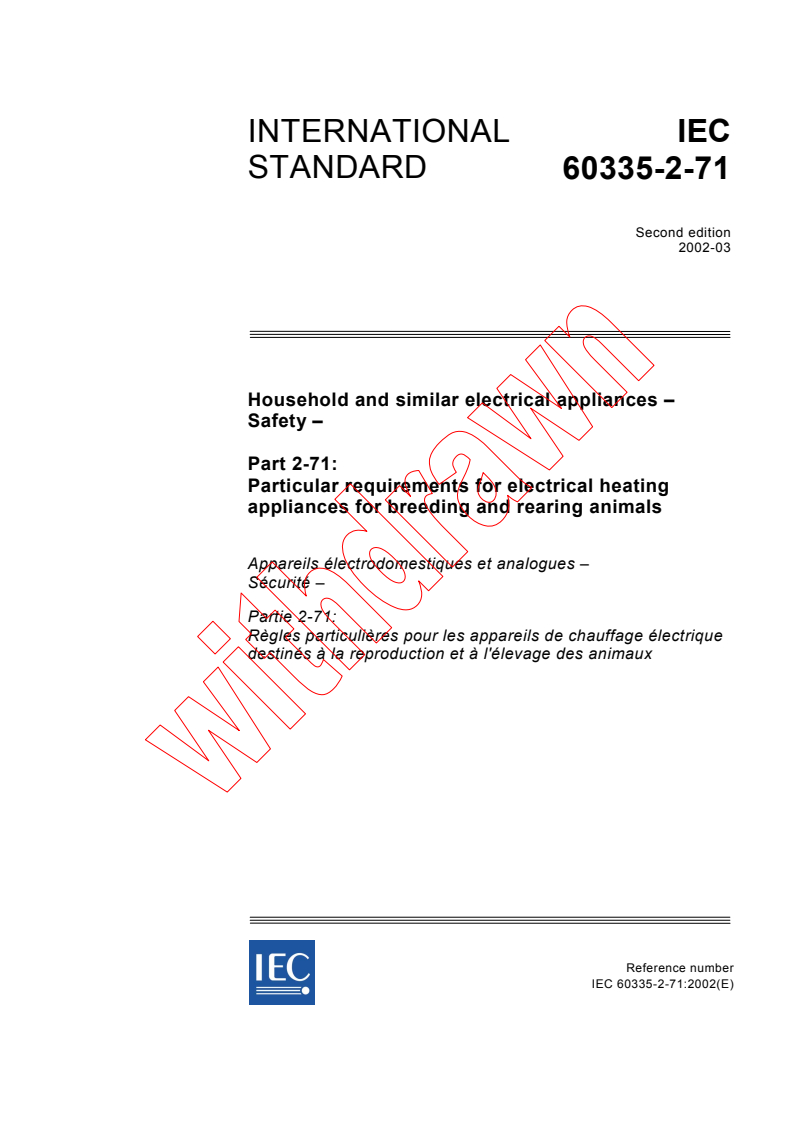 IEC 60335-2-71:2002 - Household and similar electrical appliances - Safety - Part 2-71: Particular requirements for electrical heating appliances for breeding and rearing animals Released:3/20/2002