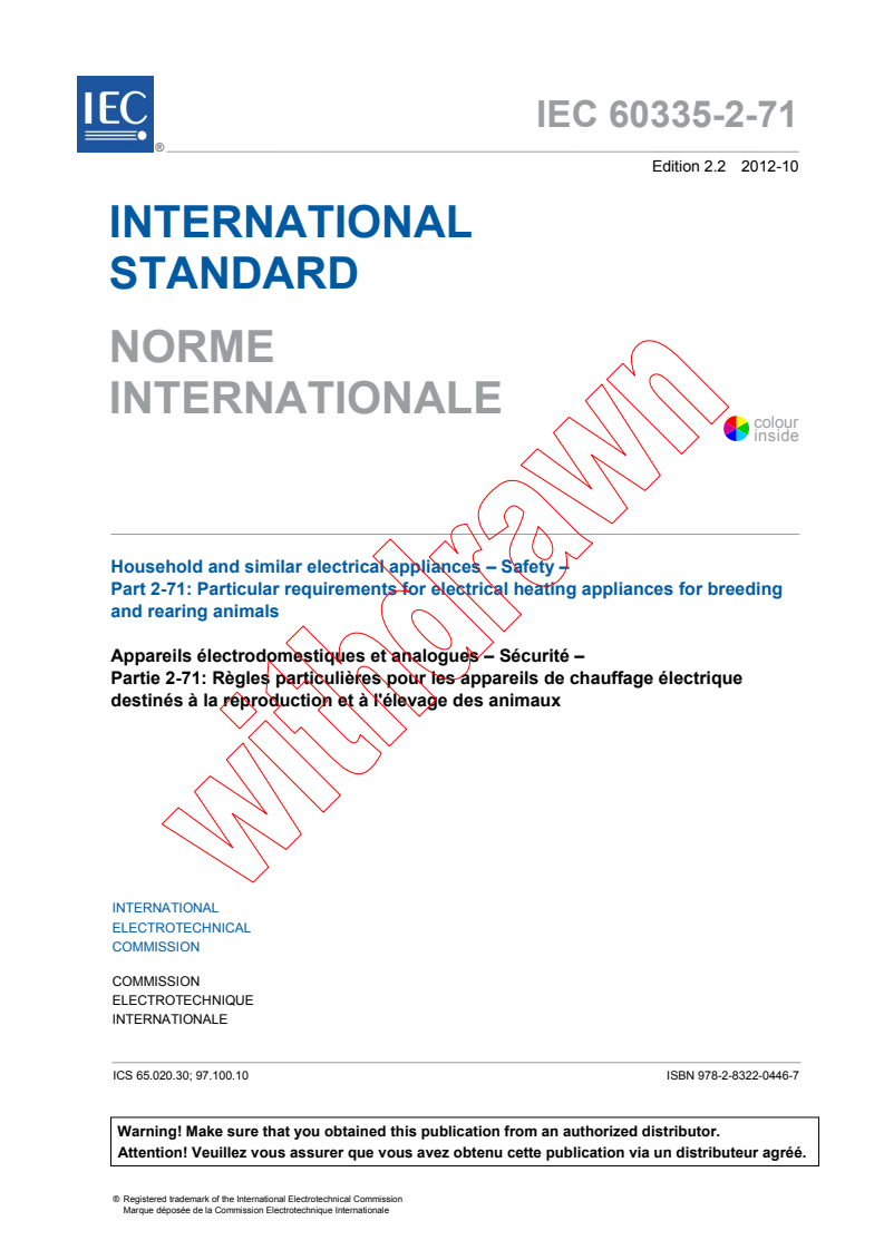IEC 60335-2-71:2002+AMD1:2007+AMD2:2012 CSV - Household and similar electrical appliances - Safety - Part 2-71: Particular requirements for electrical heating appliances for breeding and rearing animals Released:10/26/2012