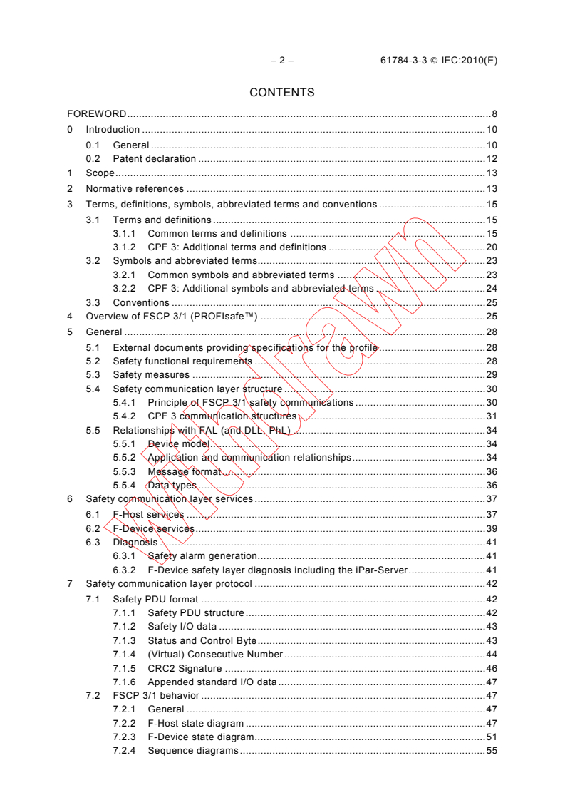 IEC 61784-3-3:2010 - “Industrial communication networks – Profiles – Part 3-3: Functional safety fieldbuses – Additional specifications for CPF 3” defines a safety communication layer (services and protocol) for CPF 3 profiles. Built on CPF 3 of IEC 61784‑1, relevant CP variants from IEC 61784‑2 (CP 3/1, 3/2, 3/4, 3/5, 3/6) and IEC 61158 Types 3 and 10, this second edition (2010 / bilingual 2012) updates the protocol and management rules for safe fieldbus communications, e.g. PROFIsafe (FSCP 3/1). The standard identifies principles from IEC 61784‑3 applicable to CPF 3 and provides technical revisions such as a secondary watchdog timer, GSDL/GSD handling, CRC requirements and parameterization controls.