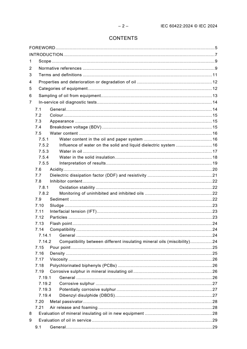 IEC 60422:2024 provides monitoring guidance and procedures that are required for the use and maintenance of mineral insulating oils and other hydrocarbon-based liquids in transformers and other electrical equipment, including strategic spares and tanks for holding spare parts and components. This document is applicable to mineral insulating oils, originally supplied conforming to IEC 60296, in transformers, switchgear and other electrical apparatus where oil sampling is reasonably practicable, and where the normal operating conditions specified in the equipment specifications apply. This document is also intended to assist the power equipment operator to evaluate the condition of the oil and maintain it in a serviceable condition. It also provides a common basis for the preparation of more specific and complete local codes of practice. The document includes recommendations on tests and evaluation procedures, and outlines methods for reconditioning and reclaiming oil, and the decontamination of oil contaminated with PCBs. NOTE The condition monitoring of electrical equipment, for example by analysis of dissolved gases, furanic compounds or other means, is outside the scope of this document.
