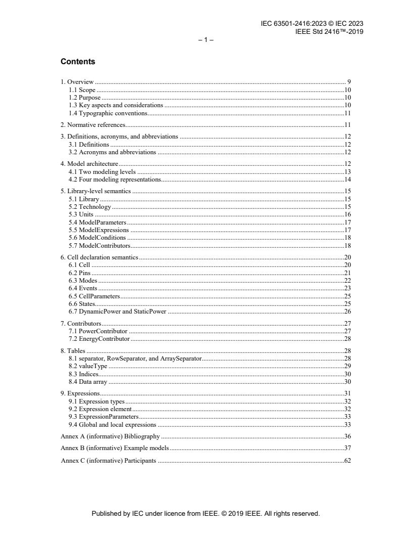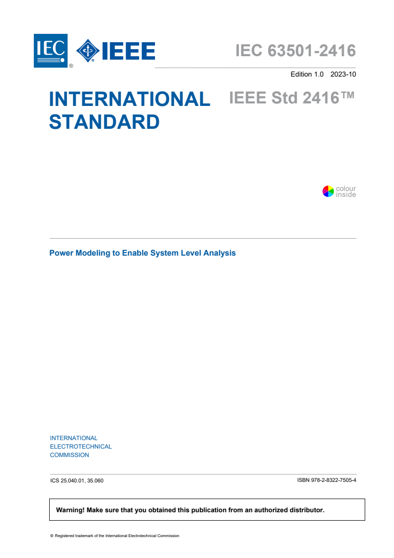 IEC 63501-2416:2023 (also published as IEEE Std 2416) defines a parameterized, abstracted power modeling framework to enable accurate system-level power, software, and hardware IP-centric analysis and optimization. Published as an IEC–IEEE double-logo standard (Edition 1.0, 2023-10), it describes concepts and requirements for building power models that are efficient, complete, and portable across process, voltage, and temperature (PVT) conditions. The standard targets system-level power/thermal analysis by specifying the information content and architecture needed for reusable power models.