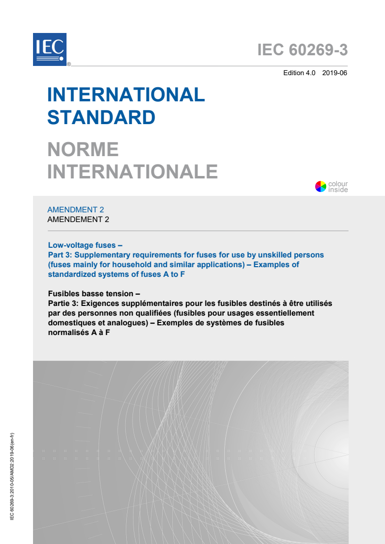 IEC 60269-3:2010/AMD2:2019 - Amendment 2 - Low-voltage fuses - Part 3: Supplementary requirements for fuses for use by unskilled persons (fuses mainly for household or similar applications) - Examples of standardized systems of fuses A to F Released:6/11/2019